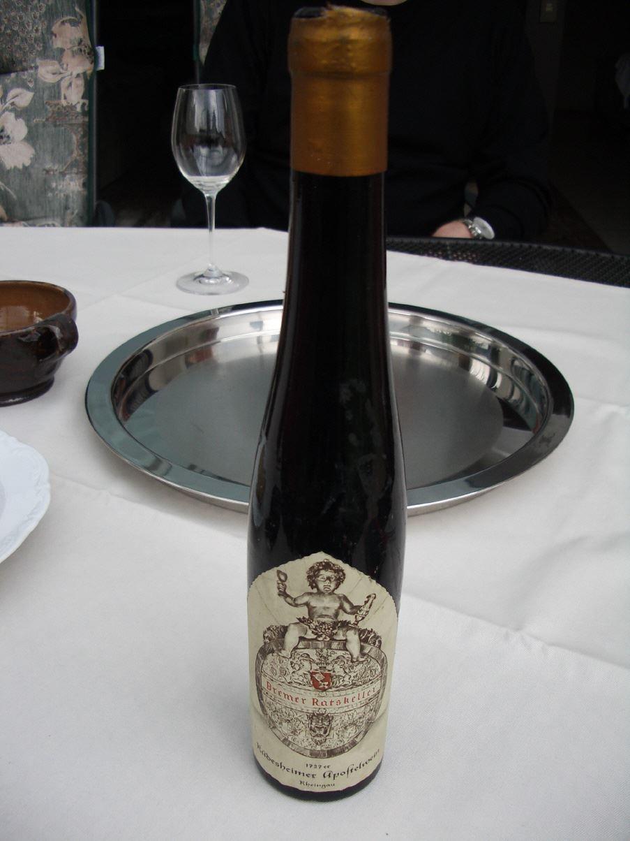 Im Bremer Ratskeller liegt er in einem Faß, der legendäre 1727 Rüdesheimer Apostelwein. Zu besonderen Gelegenheiten wird schon mal ein halbes Fläschchen abgefüllt. Längst nicht so oft aber, wie die in der letzten Zeit sich auf Auktionen häufenden Angebote dieses Weines glauben lassen. Ein 2000 speziell für eine englische Chistie s Auktion abgefüllte, halbe Flasche erbrachte etwa 6.500 Euro.