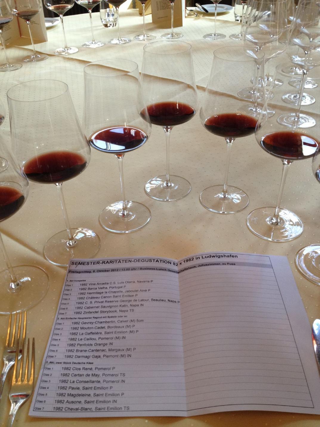 Einfach nur mausetot der 1982 Gevrey-Chambertin von Calvet mit sehr reifer, bräunlicher Farbe und säuerlichem Gaumen. Erinnerte in der gesamten Anmutung eher an ein billiges Haarwaschmittel als an Rotwein. Erstaunlich gefällig die Nase des 1982 Mouton Cadet, ein einfacher, immer noch gut trinkbarer Wein ohne Höhepunkte 84/100. Kräftige und dicht die Farbe des 1982 Gaffelière, in der Nase Kaffee, Mokka und Schokolade, am Gaumen elegant und schmeichlerisch 93/100. Muffig und schwierig die Nase des 1982 Le Caillou aus Pomerol, wirkte auch am Gaumen eher wie frisch vom Entrümpler 80/100. Da wateten wir hier als Einstieg durch die Untiefen des Jahrgangs, unterbrochen nur durch wenige Lichtblicke, da tauchte plötzlich einer der besten Weine der Probe auf, dieser unsterbliche 1982 Penfolds Grange. Ein großer, reifer Grange, voll da mit viel Sex Appeal, allerdings mit Potential für noch lange Jahre. Süße Cassis-Frucht, Minze, Eukalyptus, dabei nicht überladen, sondern sehr fein und elegant, ein anderer Stil als die heutigen Aussie-Boliden - 99/100. Lust auf mehr machte die fruchtige Nase des 1982 Brane-Cantenac aus der Magnum, doch am Gaumen baute dieser Wein rasch ab, von der Schokolade blieb nur noch das Staniolpapier 87/100. Überraschend fruchtig und jung der 1982 Darmagi von Gaja, die Nase baut rasch ab, der Gaumen bleibt, die gute Farbe deutet noch längeres Leben an, ein Wein, der besser zu begleitendem Essen passt 90/100.