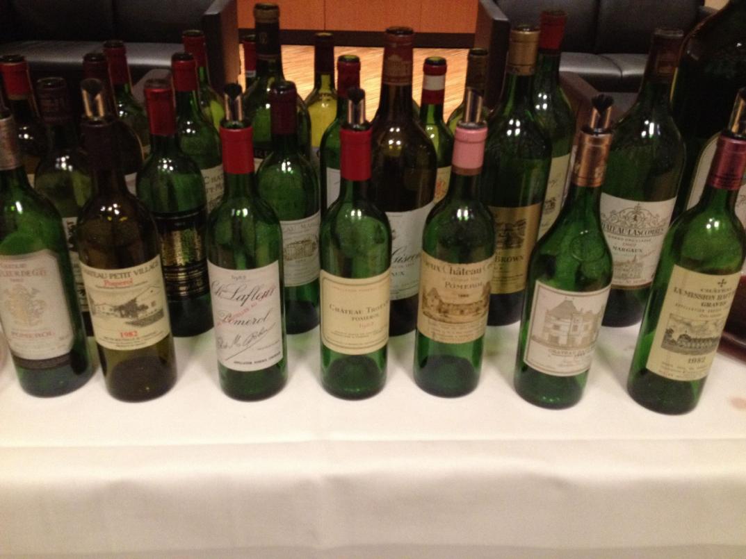 Und dann kam auch schon der erste Abend, bis auf den ersten Tischwein nur Bordeaux mit reichlich wohlklingenden Namen. Aber da es ja in der Summe 82 Weine sein sollten, musste leider auch der erste Flight sein. 1982 La Cardonne aus Medoc hatte eine muffig-modrige Nase und war einfach nur bitter und spaßfrei am Gaumen 82/100. Auf ähnlichem, sicher nicht höherem Niveau wäre wohl auch der 1982 Citran gewesen, der sich aber durch einen fürchterlichen Kork einer Blamage entzog. Ganz ok war der der 1982 Poujeaux, ohne Fehler, aber sicher inzwischen deutlich über den Zenit zumindest aus dieser Flasche und einfach nur langweilig im Glas 83/100. Deutlich besser kenne ich 1982 Sociando Mallet, der hier zwar eine gute Frucht hatte, aber auch einen deutlichen Fehlton 82/100. Auch der 1982 Peyrabon aus Pauillac schien zumindest in der Nase einen Fehler zu haben, am Gaumen war er ganz ok 81/100. Der 1982 Fonréaud aus Listrac war ein unspannendes, dünnes Wässerchen 80/100
