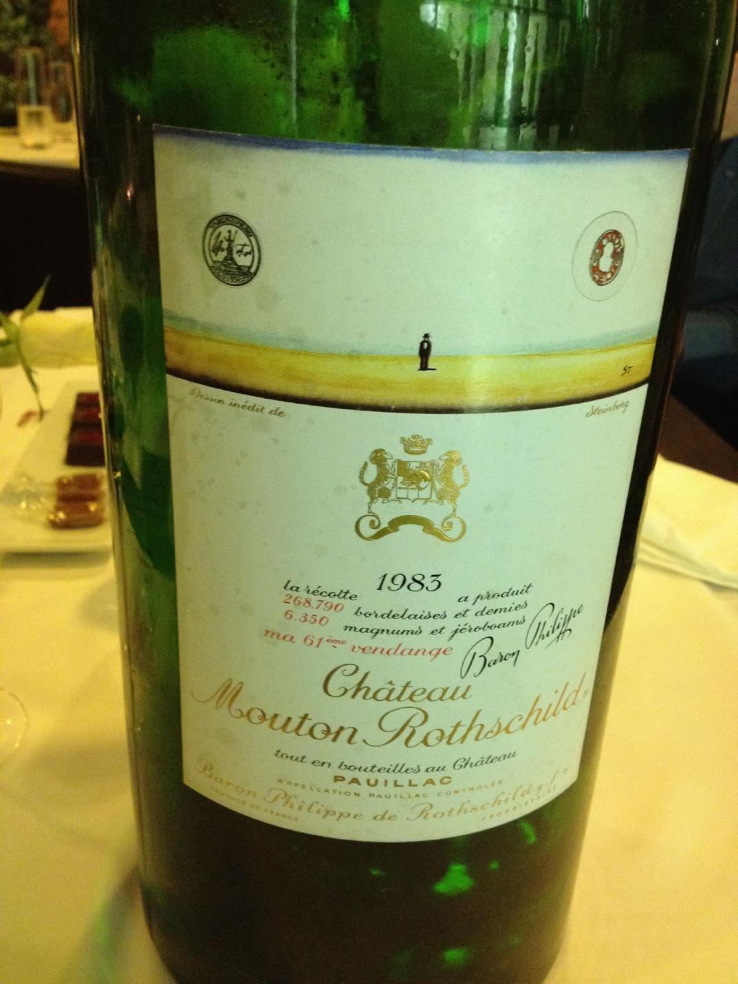 Noch ein paar Worte zum "Rahmenprogramm" der Probe. Einen hochkarätigen Tischwein hatte der liebe Bernd angestellt. Und bei diesem 1983 Mouton Rothschild hatten wir gleich in dreifacher Hinsicht Glück. Zum einen war es das spendable Flaschenformat einer Jeroboam, zum anderen die enorme Jugend dieses Weines und die klassische Mouton Aromatik mit Minze, Sattelleder und Bleistift. Und dann trug zu unserem Glück natürlich noch bei, das am anderen Tisch der gute René etwas von einem Fehler oder Kork gemurmelt hatte. Und das war das größte Glück überhaupt, denn fortan hielt sich der "andere Tisch" völlig zurück und überließ uns diesen zweifelsohne großen(94/100) Wein. Ich liebe Mouton, ich liebe den 83er, und ich liebe ihn vor allem aus großen, vollen Gläsern. Und wenn ich einfach nur zu blöd war(wie übrigens alle an "unserem" Tisch, diesen Fehler oder die vermeintliche Dumpfheit zu bemerken, dann liebe ich ab sofort auch meine Blödheit. Hat sie mir doch ein großes Weinerlebnis beschert. Unser Wein-Literat Stevie Trarach hätte es anders formuliert: Fehler hin und Fehler her, der Genuss fiel hier nicht schwer.