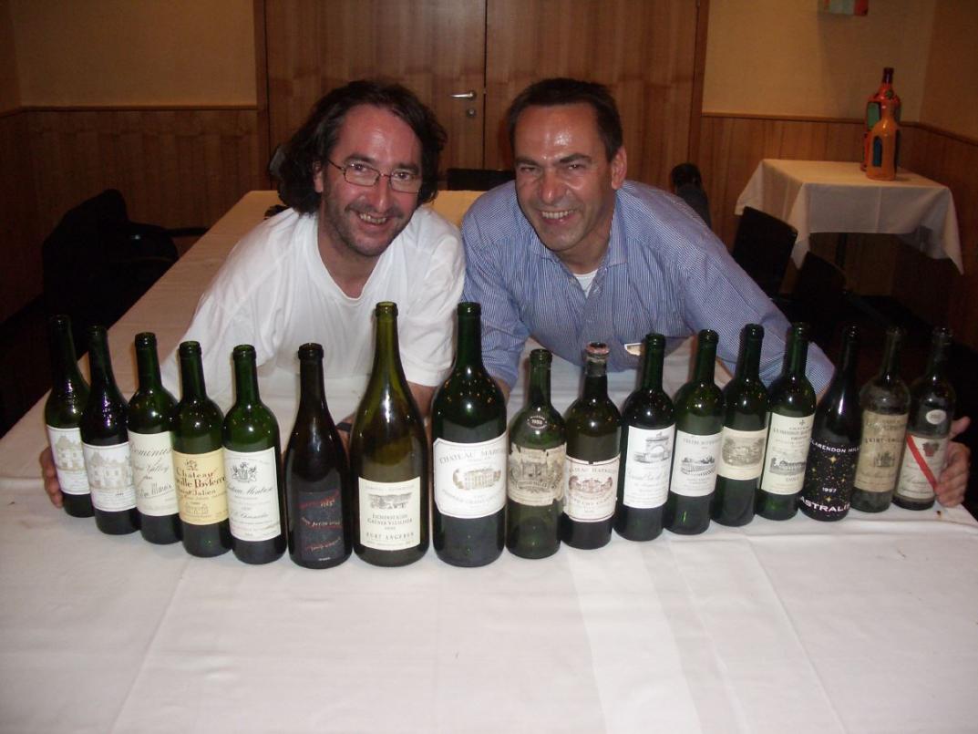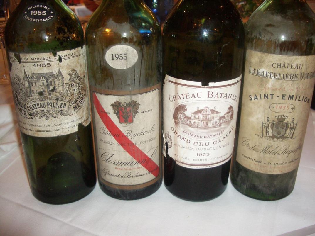 Voll ins Eingemachte ging es dann mit vier Flaschen, denen man sicher nicht übermäßige Jugend nachsagen konnte. Eine reife Farbe mit deutlichem Alterston hatte 1955 Palmer. Das war reifer Margaux par Excellence, feinduftige, elegante Nase, feine, leicht karamellig wirkende Süße, da war aber immer noch Fülle am Gaumen und trotz deutlicher Altersnote eine faszinierende, seidige Eleganz. Ein Traumstoff, der sich sicher in guten Flaschen noch einige Jahre auf diesem hohen Niveau hält 95/100. Wohl nicht die beste Flasche war 1955 Gaffelière-Naudes, den ich nahe der Perfektion kenne. Hier hatte er jetzt eine leicht animalische Nase mit massig Dörrfrüchten, baute am Gaumen leider sehr rasch ab und entwickelte eine immer stärkere Säure, nur die Nase blieb stabil. Was tun? Schnell noch einen großen Schluck vom Depot. Da ging dann auch am Gaumen die Post ab, komplex, fast explosive Aromatik, irre lecker, macht zusammen 87-96/100. Also nur eine schlecht gelagerte Flasche. Nach 55 Gaffelière-Naudes in gutem Zustand kann getrost weiter gesucht werden. Mehr als entschädigt wurden wir durch eine Ausnahmeflasche des 1955 Beychevelle. Allgemein gilt der als kleiner, nicht gerade berühmter Wein. David Peppercorn hatte dafür vor 16 Jahren in seinem Standardwerk "Bordeaux" nur einen Kommentar übrig: a disappointment. Wie gut, dass Weine nicht lesen können. So entwickeln sie sich völlig unabhängig von der Lehrbuchmeinung. Enttäuschungen und Überraschungen sind gleichmäßig gesät und finden sich immer dort, wo man es nicht erwartet. Eine sehr feine, immer noch fruchtige, süße Nase hatte der Beychevelle, mit viel Schokolade und Mokkatönen. Auch am Gaumen feine Süße und wie in der Nase eine unglaubliche Eleganz, dabei insgesamt deutlich jünger wirkend. Ein riesengroßer Wein, mit dem legendären 29er zusammen mein bisher bester Beychevelle 97/100. Kein Genuss dagegen 1955 Batailley. Mostige, apfelige Nase, relativ trübe, dunkle, bräunliche Farbe, wirkte säuerlich, wie alter Tresterhut. Nicht mehr, oder nur mit Schmerzen trinkbar war er, dieser mehrfach nachvergorene Äbbelwoi.