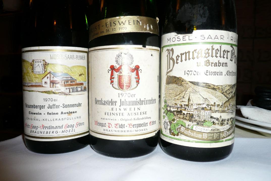 Den Abend unterm Weihnachtsbaum hatten sich die Moselwinzer 1970 redlich verdient. Mussten sie doch am Heiligen Abend morgens früh raus, um hart gefrorene Trauben zu ernten. Massiver Frost in der Nacht zum 24.12.1970 brachte ihnen in einem Jahr, das nicht gerade als groß zu bezeichnen war, wenigstens noch ein paar ansehnliche Eisweine ein, die dazu noch den Namen Christwein tragen konnten. Die Prädikate dieser Weine waren durch die Bank nicht sehr hoch, da viele Trauben zum Ende des Jahres durch den sehr späten Sommer nicht voll ausgereift waren. Den Weinen hat es nicht geschadet. Leider wurde der 1970 Bernkasteler Johannisbrünnchen Eiswein feinste Auslese Christwein von Licht-Bergweiler, der hellste des Flights, deutlich in der Nase und am Gaumen von Kork getrübt. Immerhin erkannte man darunter einen sehr feinen, fast filigranen, von Honignoten geprägten Wein. Grandios der 1970 Bernkasteler Doctor und Graben Eiswein Auslese Christwein von Thanisch. Gülden die Farbe, in der prächtigen Nase Honignoten und Mango-Chutney, am Gaumen die Süße eher etwas verhalten und durch die kräftige Säure perfekt balanciert, ein absolut stimmiger, sehr harmonischer Wein, sehr lang am Gaumen 96/100. Dürfte es noch länger machen. Die Zwillingsflasche habe ich mal gedanklich für Heiligabend 2020 reserviert. Deutlich reifer und dunkler in der Farbe der 1970 Brauneberger Juffer Sonnenuhr Eiswein feine Auslese von Fritz Haag, Honig ohne Ende, karamellige Süße, verhaltene Säure und trotzdem das Verspielte, die Leichtigkeit der Haag-Weine 93/100.