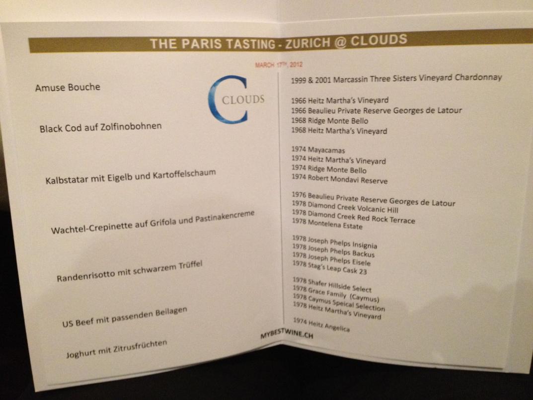 Bestens eingestimmt und aviniert waren wir. Erst der Film Bottle Shock und dann das 1976 Paris Tasting. Und jetzt, nach einer längeren, kreativen Pause ein Feuerwerk außergewöhnlicher Raritäten aus Kaliforniens Goldenen Jahren, begleitet von einem großartigen Menü, wie ich es im Großraum Zürich selten auf dem Teller hatte. Ja, es stimmte einfach alles an diesem Abend in der luftigen Höhe des Restaurant Clouds im Züricher Prime Tower.
