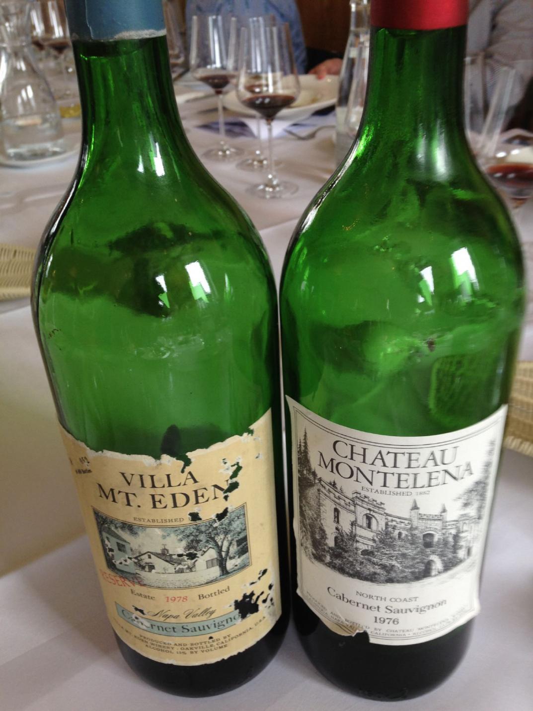 Nein, der liebe Eugen wollte nicht, dass wir verdursten und Werni Toblers geniale Küche trocken oder gar mit Wasser verdünnt runterwürgen. Also gab es auch noch zwei herrliche Magnums als Tischwein. Beide Weine zeigten, dass es damals auch abseits der ganz großen Namen große Weine gab. Der 1978 Villa Mt. Eden Cabernet Sauvignon war ein feiner, eleganter, minziger, schmelziger Wein in bester 78er Bordeaux-Stilistik, noch voll da mit Kraft am Gaumen 93/100. Ein irres Geschoss mit tiefdunkler Farbe, mit Kraft, Druck und Länge der 1976 Chateau Montelena North Coast Cabernet Sauvignon 95/100. Der hätte auch gut in den nächsten Flight gepasst.