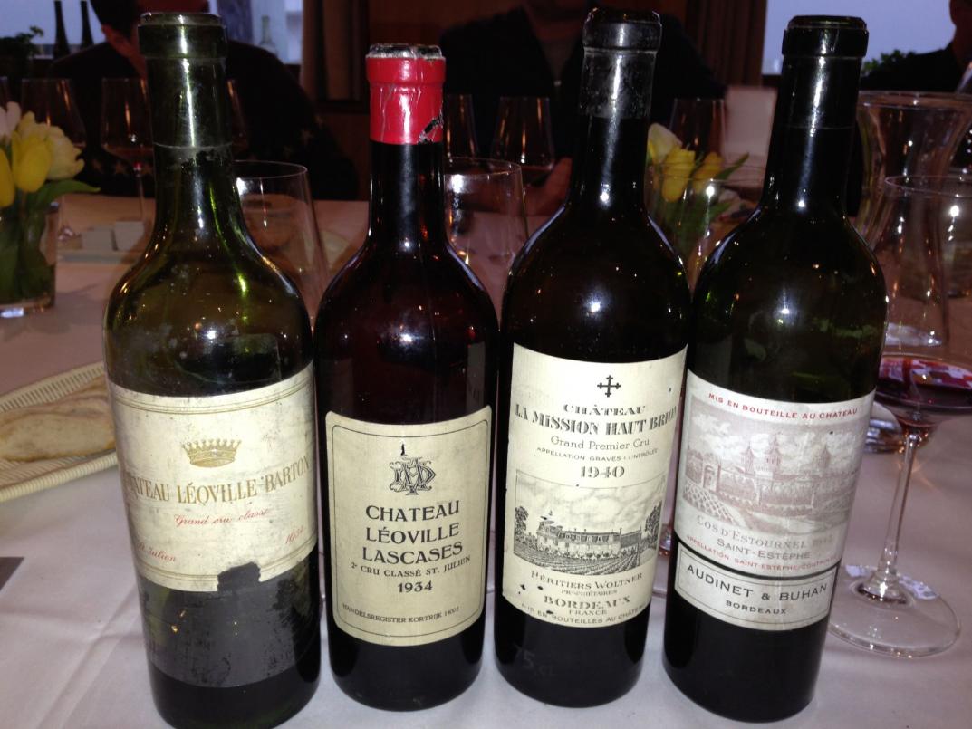 An einen großen Cheval Blanc aus den 50ern erinnerte mich dieser prächtige 1934 Léoville Barton. Traumnase, an de rich stundenlang riechen könnte, Eleganz pur, seidig und weich am Gaumen, ewige Länge 97/100. Deutlich heftiger und kräftiger war 1934 Leoville las Cases, der mit viel Minze in Bitterschokolade wie After Eight wirkte 95/100. Reif und doch nicht alt war der schier unglaubliche 1940 La Mission Haut Brion aus einem schwierigen Jahr, wunderbare Nase mit Teer, Tabak und schwarztee, am Gaumen absolut stimmig, aber auch mit enormem Druck, ein großer Wein ohne Alter 94/100. Unverschämtes Flaschenglück hatte der Dani an diesem Tag, und wir natürlich mit ihm. So präsentierte sich auch der 1945 Cos d Estournel als großer, kräftiger, kompletter Bordeaux mit immer noch spürbaren Tanninen und sicher noch längerem Leben 96/100.