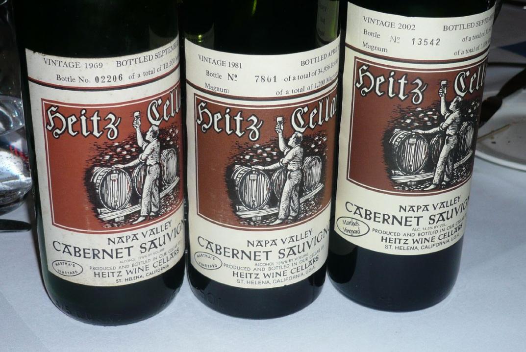 Geradezu spektakulär im darauffolgenden Heitz Dreierflight ein 1969 Heitz Martha s Vineyard. Minze im Wein ist ja an sich nichts besonderes, aber was hier abging, das war schon außergewöhnlich. Noch nie habe ich in einem Wein auch nur annähernd so pure Minze gehabt, und das nicht nur in der Nase, sondern auch am Gaumen. Unter dieser dominanten Minze verbargen sich Kirschfrucht, Bitterschokolade und Eukalyptus. Dazu kamen unbändige Kraft und eine noch fast jugendliche Frische. Ein Wein mit immenser Strahlkraft, der dem legendären 74er sicher ebenbürtig ist 98/100. Erstaunlich gut zeigte sich auch 1981 Heitz Martha s Vineyard, ebenfalls mit viel Minze und Eukalyptus, aber auch mit guter Frucht, dabei etwas zivilisierter und harmonischer als 69, sehr balanciert und ohne Schwächen oder Alter, die junge Farbe und das gute Tanningerüst lassen auch hier noch auf etliche Jahre großes Trinkvergnügen hoffen 94/100. Immerhin hatte ich diesen 81er, der sonst nirgendwo auf dem Radarschirm auftaucht, schon mal vor zwei Jahren bei den Ungers mit 97/100 im Glas. Reichlich Babyspeck brachte 2002 Heitz Martha s Vineyard mit. Dicht, konzentriert, deutlich üppiger als der grandiose 2001er wirkend, muss sicherlich noch zu sich finden und ist mir zum jetzt trinken zu heftig 93+/100. Ich bezweifle, dass die modernen Heitz aus dem 1993 neu bepflanzten Rebberg ähnlich gut altern, wie die klassischen Martha s bis 1992. Immensen Spaß bereiten sie trotzdem und sie so wie die Klassiker jede Suche wert. Sehr dankbar bin ich hier Robert Parker. Der ignoriert Heitz weitgehend und sorgt so dafür, dass es immer noch Nachschub zu akzeptablen Preisen gibt. Möge das noch länger so bleiben.
