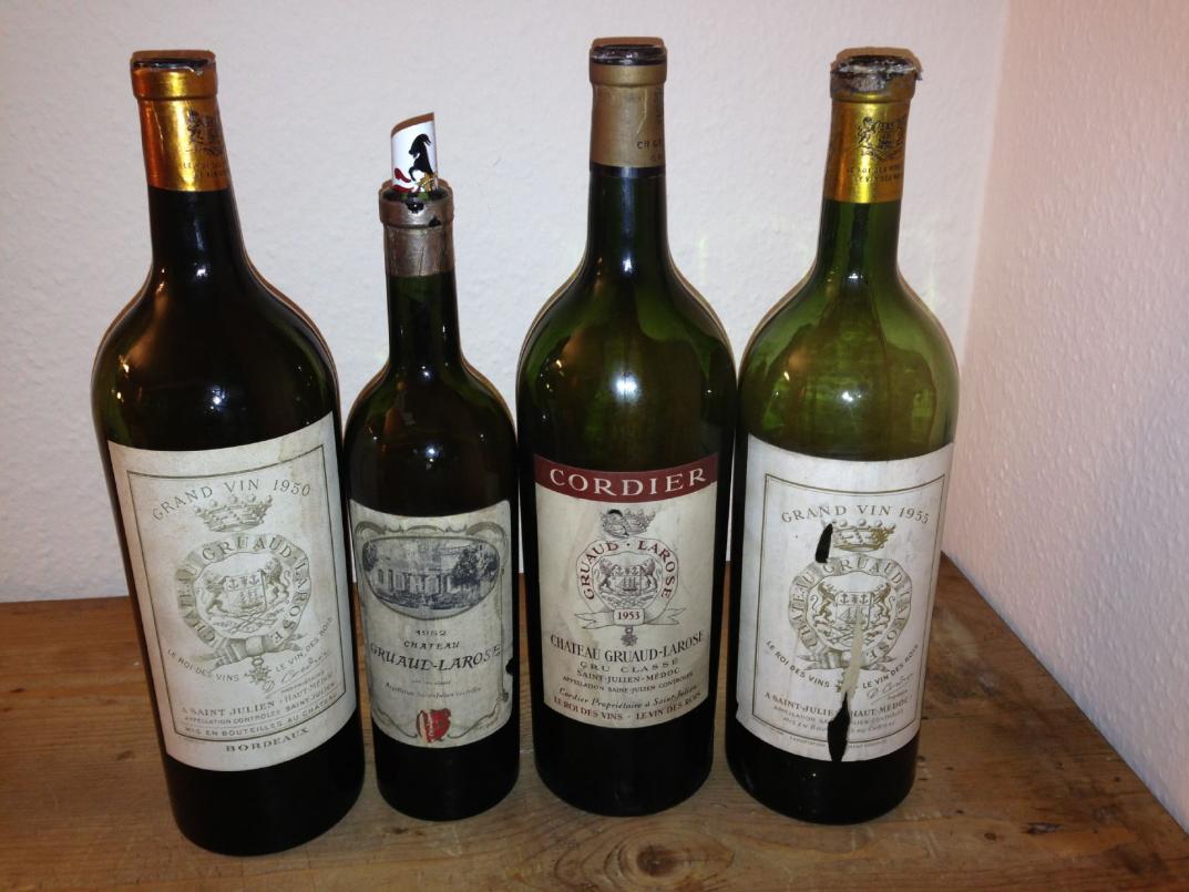 Aber jetzt ging es erst richtig los. Ein Hammerflight mit drei perfekten Magnums stand uns bevor. Etwas verloren stand zwischen den Boliden in der 1tel 1952 Gruaud Larose. Da bei war das ein durchaus sehr guter Guaud mit herrlicher Kaffeenase, aber auch mit strammer Säure 90/100. Und dann dieser schier unglaubliche 1950 Gruaud Larose aus der Magnum mit einer Wahnsinnsfarbe, der dichtesten des Flights. Immer noch so jung, sehr kraftvoll im Auftritt, aber auch mit feiner Süße am Gaumen, hatte ich noch nie so gut im Glas 94/100. Einfach sprachlos und glücklich zugleich machte 1953 Gruaud Larose aus der Magnum. Einfach ein Über-Gruaud nahe der Perfektion mit herrlicher Frucht, mit wunderbarem Schmelz, mit toller Struktur und irrer Länge am Gaumen. Das war Premier Cru Niveau und ein einmaliges Erlebnis 97/100. Eigentlich war es ein zweimaliges Erlebnis, denn das vorher gesagte galt ohne Abstriche auch für den 1955 Gruaud Larose aus der Magnum, der vielleicht einen Tick weiter und reifer war, aber ebefalls ein Traumwein mit unglaublich druckvoller Aromatik 97/100. Solch perfekt gereifte Gruauds sind wie ein Audi mit Ferrari-Technik, aber zum Audi-Preis.