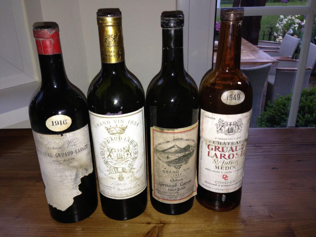 Fast hundert Jahre hatte der erste Rotwein des Abends, der 1916 Gruaud Larose, auf dem Buckel. Und dann diese sensationelle Farbe, diese enorme Kraft, diese Struktur und diese Dichte. Ein im besten Sinne kerniger und deutlich jünger wirkender Wein mit der Traumnase gut gereiften Cabernets 95/100. Dieser Wein aus dem besten der Kriegsjahrgänge des 1. Weltkrieges ist noch lange nicht am Ende. Wir profitieren heute davon, dass die besten 16er mit ihrem strammen Tanningerüst über Jahrzehnte nicht trinkbar waren. Sehr zwiespältig der 1934 Gruaud Larose, eigentlich aus dem besten Bordeauxjahrgang der 30er. Aber die Flasche muss irgendwann misshandelt worden sein. Helle, bräunliche Farbe, deutliche Farbausfällung. Wirkte einfach kaputt mit reichlich Maggi. Doch trinken konnte man ihn trotzdem, denn am Gaumen entschädigte eine erstaunlich generöse Süße, als ob sich der Gruaud dagegen wehrte, weggeschüttet zu werden 86/100. Ja, ich habe ihn ausgetrunken. Ein Charmeur der 1947 Gruaud Larose mit voll intakter Farbe, wunderbarer, karamelliger Süße, keinerlei Alterstöne, langer Abgang 94/100. Etwas kantig wirkte der 1949 Gruaud Larose, was vor allem an der hohen Säure, die ihm zwar Frische verlieh, aber auch einen Teil des Charmes eines reifen Cabernets raubte. Am besten gefiel mir bei diesem, insgesamt noch gut trinkbaren Wein die verschwenderische Kaffeenase, in der sich auch noch deutliche Fruchtreste zeigten 88/100. Gut, 49 Gruaud geht deutlich besser. Das hatte uns Elke 2011 im Schloss Loersfeld vor 2 Jahren mit der Zwillingsflasche gezeigt, die deutlich jünger auf 95/100 Niveau brillierte. Zwei große Weine unter den vier Senioren der Probe waren keine schlechte Ausbeute. Man hörte förmlich, wie Elke ein Stein vom Herzen fiel.