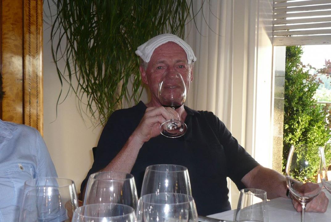 Eine andere, logistische Herausforderung für den lieben Bernd, unseren Gastgeber, waren die aberwitzigen Temperaturen. Wie bekommt man bei 35 Grad Außentemperatur und nicht weniger im Probenraum Rotweine lang genug dekantiert mit idealer Trinktemperatur ins Glas? Auch dafür gab es eine, zur Nachahmung empfohlene Lösung. Die Weine wurden morgens dekantiert und nach etwa einer Stunde in die ausgespülten Flaschen zurückgegossen. In diesen Flaschen blieben sie dann bis zum Ausschenken bei etwa 10 Grad im Keller bzw. im Kühlschrank. So kamen die Weine kühl genug ins Glas, in dem sie sich rasch erwärmten. Wir konnten alle Weine mit idealer Trinktemperatur genießen. Eine ganz andere Frage ist natürlich, ob solche Temperaturen überhaupt für Rotweinproben geeignet sind, zumindest in nicht-klimatisierten Räumen. Wie der Wineterminator dieser Herausforderung begegnete, sehen Sie auf dem Foto. Und soviel sei bereits gesagt. Unsere durchweg kurzhosige Truppe überstand diese prächtige Probe in allerbester Stimmung ohne irgendwelche Probleme.