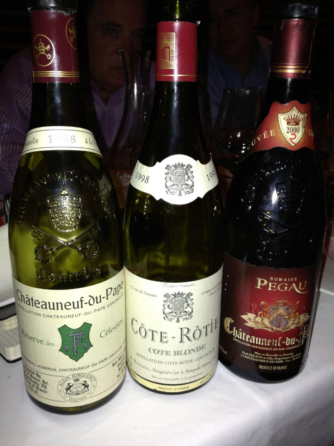 Mit dem letzten Rotweinflight kamen wir an die Rhone. In keine Schablone passte der gewaltige, eigenständige 1988 Chateauneuf-du-Pape Reserve des Celestins von Henri Bonneau. Animalisch, fleischig dicht und kräftig, blutiges Steak vom Holzkohlengrill, würzig, kräuterig, süße Kirschfrucht, dabei mit erstaunlicher Frische WT95. War der jetzt reif? Wird er es jemals? Wahrscheinlich eine rein akademische Frage, denn dieses Zeugs ist so selten und für einen Chateauneuf unbezahlbar, dass ich ihn wohl so schnell nicht wieder ins Glas kriege. Eher enttäuscht hat mich der 1988 La Landonne von Rostaing. Das lag wohl daran, dass ich instinktiv Vergleiche zu den großen La Landonnes von Guigal gezogen habe. Und da wirkte dieser hier schlanker, fruchtiger und auch etwas polierter WT92. Dritter im Bunde der 2000 Da Capo von der Domaine du Pegau, der bei aller Fülle und Mächtigkeit eine erstaunliche Struktur und Frische zeigte, dazu likörige Kirschfrucht und viel Garrigue. Die wohl annähernd 16% dieses Monsters spürt man erst, wenn langsam der Boden unter den Füßen verschwindet WT96.