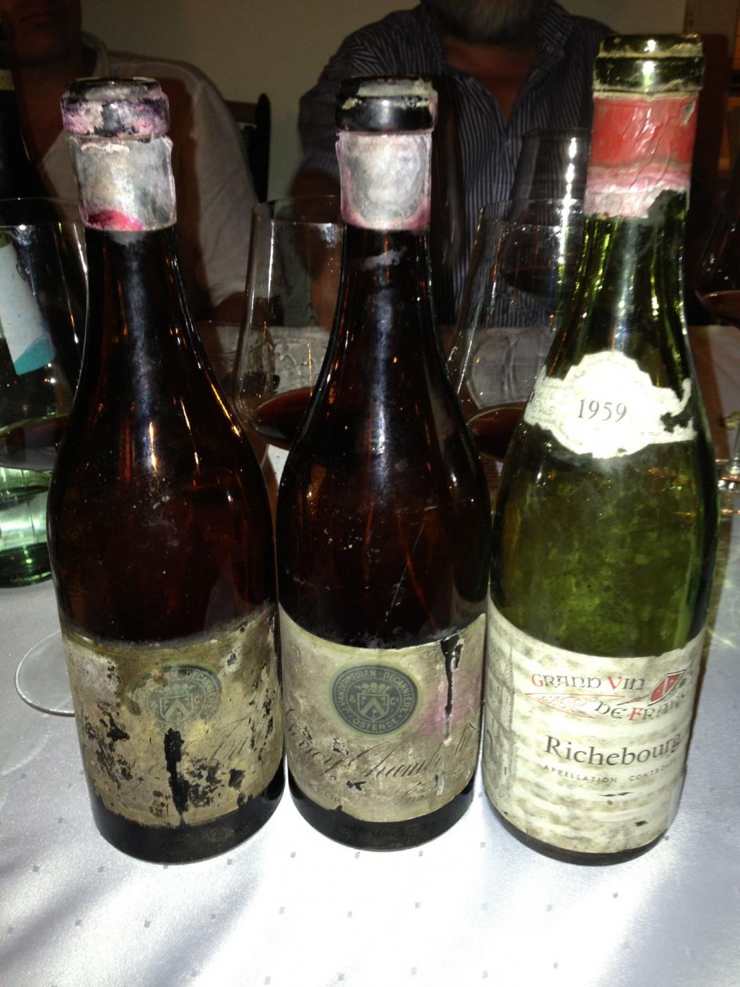 Und dann hieß es noch mal: anschnallen. Leider erst kurz vorher war der 1955 Clos de Tart Vandermeulen dekantiert worden. So konnte dieser unsterbliche, noch so irre jung, auch in der tiefen, undurchdringlichen Farbe, erscheinende Riese nur ansatzweise zeigen, was er drauf hat. Ein gewaltiges Konzentrat sehr präsenter Frucht, reichlich Kraft und Länge WT96+. Wer davon noch mal eine echte Flasche erwischt(es gibt reichlich Kopien), bitte unbedingt 5 Stunden Luft in der Karaffe gönnen. Der schiere Wahnsinn dann der etwas weicher und generöser erscheinende 1955 Gevrey Chambertin Vandermeulen, auch da ist so unglaublich viel dahinter, ein unglaublich druckvoller, vielschichtiger Wein, der im Glas und am Gaumen explodiert, einfach perfekt WT100. Eine herbe Enttäuschung war da vor allem im direkten Vergleich der 1959 Richebourg aus einer Händlerabfüllung, der von den beiden 55ern förmlich hingerichtet wurde. Kein schlechter Wein mit immer noch guter Säure, wirkte aber auf hohem Niveau für Jahrgang und Lage ganz schön schlapp WT90.