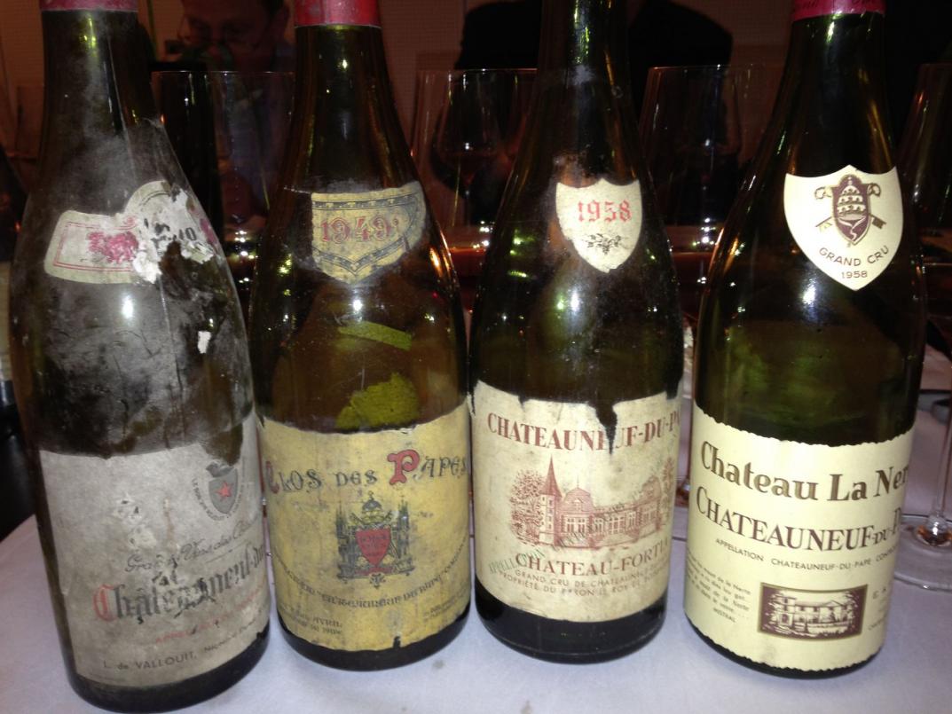 Anstrengend und rustikal wirkte der 1949 Chateauneuf von L. de Vallouit. Auch hier war des Rätsels Lösung aber ein Korkfehler, der erst mit der Zeit stärker hervor trat. Großes Kino aber der 1949 Clos des Papes mit einer fantastischen Nase, am Gaumen gelungener Spagat zwischen der Kraft eines Chateauneufs und burgundischer Pracht, Fülle und Eleganz. Voll da, altersfrei und mit toller Länge 97/100. Für das eher schwierige Jahr erstaunlich süß und füllig war 1958 Fortia 91/100. Gut trinkbar, wenn auch etwas schwierig war auch 1958 La Nerthe, hatte aber eine laktische Nase, viel Säure und erinnerte an einen überlagerten Joghurt 85/100.