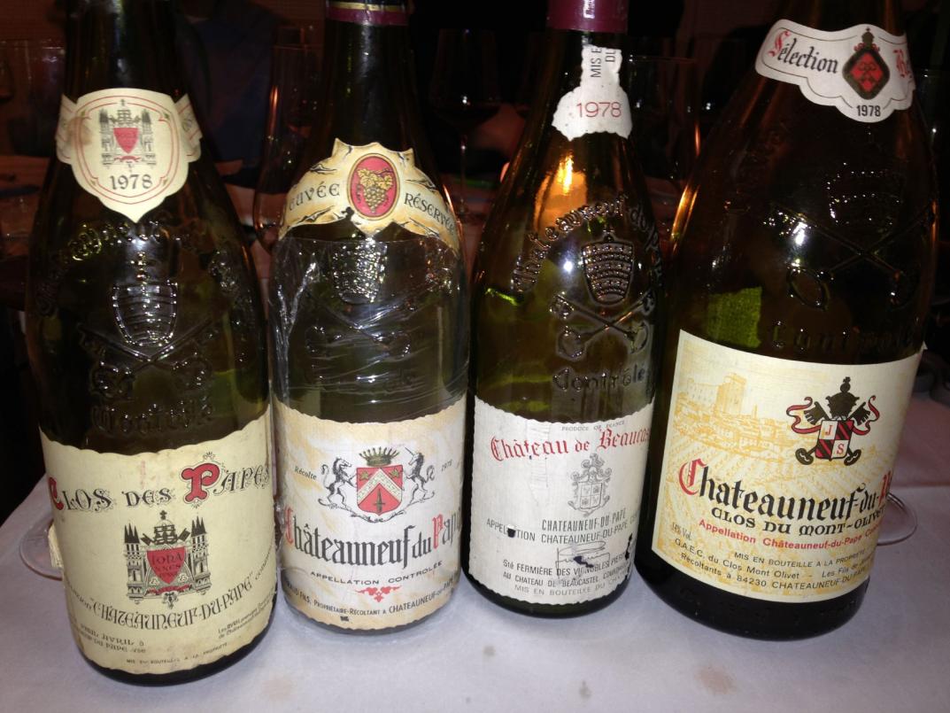 Im Flight vorher, de res ohnehin nicht brachte, wurden meine Notizen nicht nur deshalb kürzer. Gaumen und Geist ermatteten mit der Zeit einfach. Doch bei diesem Flight jetzt wurde ich noch mal hellwach. Großes Chateauneuf-Kino war der lange unterschätzte 1990 Domaine du Pégau Cuvée Laurence, der einfach Zeit zur Entwicklung gebraucht hatte und jetzt in einem perfekten Trinkstadium war, nicht nuttig oder aufdringlich, auch nicht übermäßig süß, einfach absolut stimmig und perfekt balanciert, aber mit enormer Kraft und Länge 96/100. Einfach hedonistisch schön der im Vergleich opulentere, süßere, sehr würzige 1990 Beaucastel, bei dem aber gute Struktur und Säure noch für ein längeres Leben sorgen dürften 95/100. Mehr oder minder heftige Korkfehler hatten wir ja an diesem Abend eigene, aber musste es ausgerechnet beim legendären 1990 Clos des Papes sein, der sonst das Zeug zum Wein des Abends gehabt hätte? Schade.