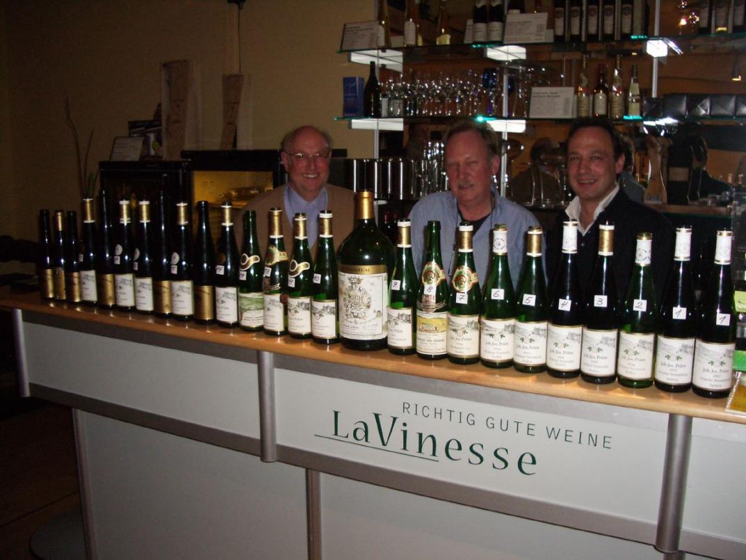 Sie gehören mit zum Interessantesten, was Deutschland und speziell die Mosel zu bieten haben, die Weine des renommierten Gutes Joh. Jos. Prüm, von Weinfans schlicht und einfach als JoJo-Weine bezeichnet. Speziell im edelsüßen Bereich setzt das Gut seit Jahrzehnten Maßstäbe. 15 Weinnasen trafen sich im Januar 2006 in der Düsseldorfer Weinhandlung La Vinesse, um gereifte, restsüße PrümWeine zu verkosten. Möglich wurde diese interessante Probe nicht nur durch das Engagement des La Vinesse-Inhabers Hartwig Fricke, sondern auch durch einen sehr generösen Weinfreund, der die Weine "zu damaligen Einkaufspreisen" zur Verfügung stellte. Nur so war eine Probe mit diesen Hochkarätern überhaupt einigermaßen darstellbar. Einen ganz besonderen Reiz erhielt die Probe noch durch die Anwesenheit eines anderen Mosel-Winzers. Markus Molitor war extra nach Düsseldorf gekommen, weil ihn diese große Palette an Prüm-Wein sehr interessierte. Der sympathische, sehr engagierte Winzer ließ es sich aber nicht nehmen, aus seinem Kofferraum die ein oder andere Rarität zu zaubern, die der Probe quasi als Einlage einen ganz besonderen Reiz verlieh.