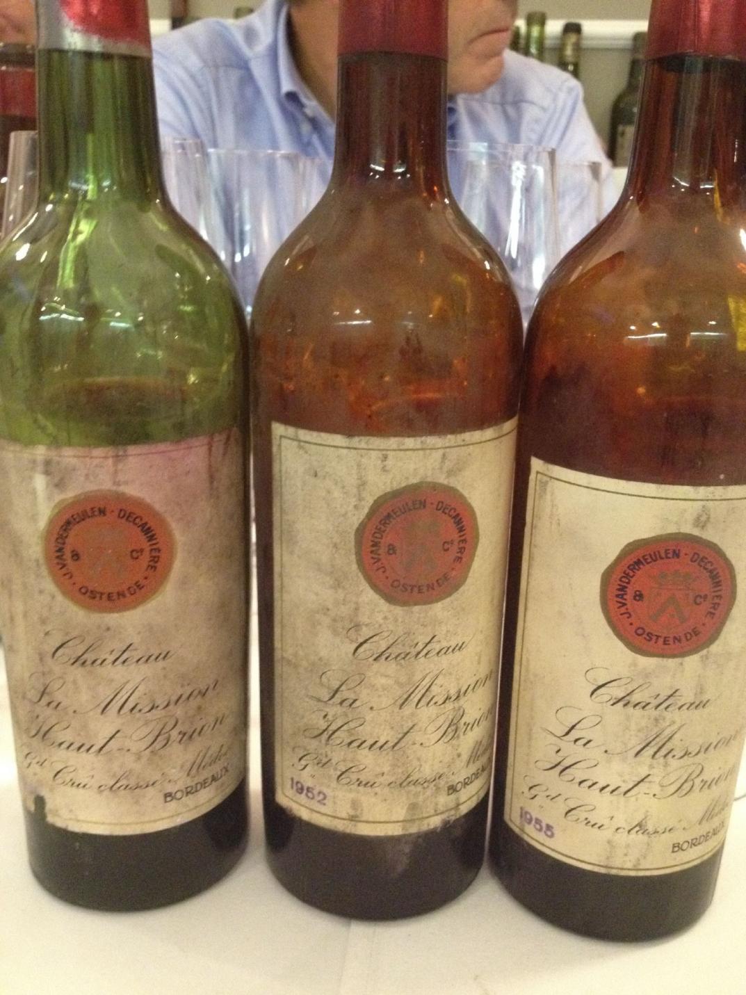 Damit kamen wir im nächsten Flight zu La Mission und zunächst zu einem weiteren 47er, der sich nahtlos unter die vorherigen Giganten einreihte. Der 1947 La Mission Haut Brion hatte immer noch eine sehr dichte Farbe ohne Alter, dazu die klassische, teerige, sehr druckvolle Cigarbox Aromatik großer La Missions, aber auch eine unglaubliche, dekadente Süße und eine geradezu entwaffnende Offenheit 100/100. Ich hätte diesen Wein wie viele andere auch einfach knutschen können. Eigentlich ist der 1952 La Mission Haut Brion auch ein süßer, erotischer Wein mit burgundischer Pracht und Fülle, doch wurde er vom 47er fast erdrückt und wirkte eine Spurernster, mineralischer und dichter, aber auch das ein Gigant 98/100. Und dann waren wir beim 1955 La Mission Haut Brion, der als perfekte Melange aus der Struktur des 52ers und der Opulenz des 47ers einfach nur sprachlos machte 100/100.