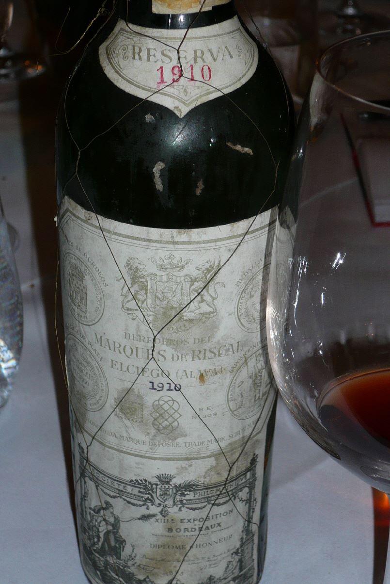 Deutlich schöner wurde es dann mit einem 1947 Grand Poujeaux in einer dänischen Abfüllung von Kjaer&Sommerfeldt. Auch der war reif mit einer relativ hellen Farbe, zeigte aber weder in der Nase noch am Gaumen erkennbare Schwächen. Feine, karamellige Süße, sehr aromatisch, elegant und absolut delikat. Die gute, stützende Säure dürfte ihn noch eine ganze Weile am Leben erhalten 92/100. Das Glas daneben auf ähnlichem Niveau und ebenfalls 92/100 wert, doch völlig anders in der Stilistik und ein grandioses Weinerlebnis. Mit diesem 1910 Marques de Riscal Reserva kann ich einen empfindliche Lücke in meinen Jahrgangs-Übersichten füllen. Mein erster 1910er, und was für ein Wein! Sensationelle Farbe, erst etwas sperrig und von der deutlichen Säure dominiert, baut unwahrscheinlich im Glas aus, wird dichter, komplexer mit karamelliger Süße, ein großer, alter Rioja.
