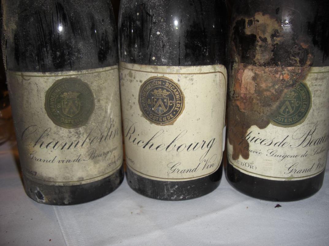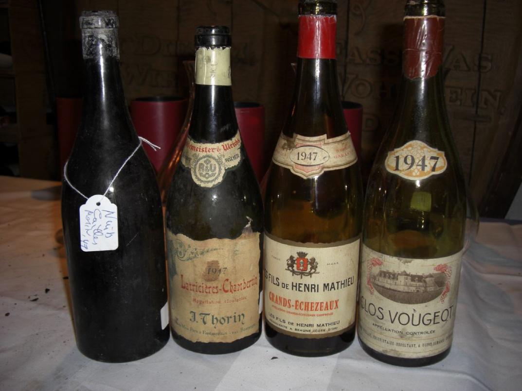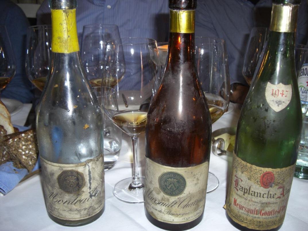 Und bevor wir dann zu den Highlights aus Burgund kamen, waren erstmal drei große Rhone-Weine angesagt. Mit hohem Suchtfaktor der 1947 Chateauneuf-du-Pape von Mont Redon. Rauchige, sehr generöse Nase, die einen mit etwas Fantasie in südfranzösische Gefilde entführt, am Gaumen komplex, druckvoll, fast explosiv, dabei aber durchaus fein mit schöner Würze und Süße, kein Burgunder, aber mit ähnlicher Pracht und Fülle, viel besser gehen ältere Chateauneufs nicht 98/100. Ich habe sehr lange nach diesem Wein, den Parker zurecht als "kolossal" bezeichnet, gesucht. Um neuere Mont Redons mache ich dagegen einen Bogen. Die sind nicht mal ein Schatten dessen, was auf diesem Gut in den 50ern und davor produziert wurde. Und dann waren wir wieder bei Chapoutier, diesmal als Erzeuger mit einem 1947 Hermitage La Sizeranne. Der reifste Wein des Flight mit prägnanter Säure, sehr würzig, elegant, aber auch bissig. Ein Klassewein, der förmlich nach begleitendem Essen schrie 95/100. Als Pirat und Experiment hatte ich einen 1947 Laudun von Joseph Pelaquié in diesen Flight geschoben. Laudun ist eine eigenständige, aber unbedeutendere Appelation in Côtes-du-Rhone Village. Aber was für ein Wein! Der jüngste des Flights, sehr kompakt, kraftvoll, massig Mokka und purer Kakao, kräftig strukturiert mit immer noch deutlichen Tanninen. Etwas mehr Charme hätte dieser nachhaltige Tropfen ruhig haben können, dafür aber schien er gemacht für die Ewigkeit 94/100.