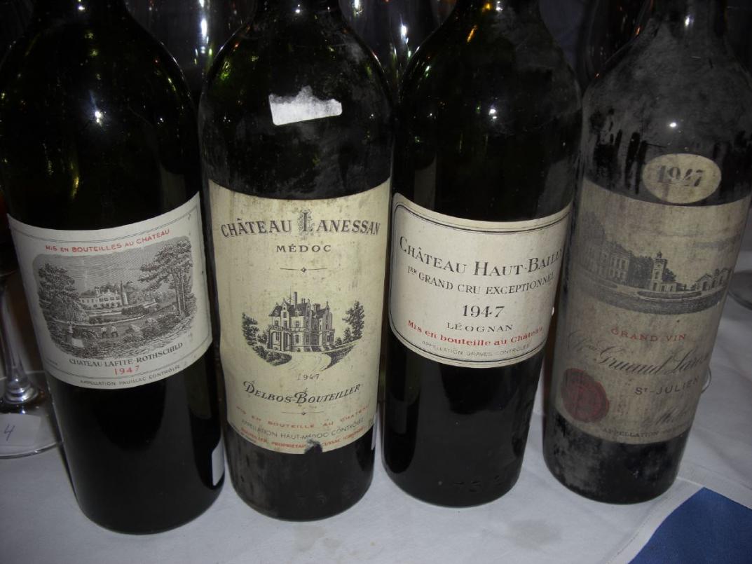 Als Abschluss tranken wir noch vier Weine vom in 1947 eher benachteiligten, linken Ufer. Die mit Abstand dichteste, jüngste Farbe hatte 1947 Lanessan, der wohl auch noch die meiste Zukunft zu haben schien, ein muskulöser Kraftbolzen in der Machart der sehr gelungenen, älteren Lanessans, mehr Power als Charme 91/100. Ein gut gelungener, reifer, weicher Schmeichler 1947 Gruaud Larose 92/100. Eine süße, viel versprechende, generöse Supernase hatte 1947 Haut Bailly, da kam der Gaumen dieses trotzdem recht feinen Weins nicht ganz mit 91/100. Ja, dann war da noch eine riesengroße Enttäuschung. Vorhersehbar zwar, denn ich habe diesen Wein immer nur unterirdisch erlebt, doch dass ein 1947 Lafite Rotschild so besch..., na gut, sagen wir bescheiden, schmecken kann, da verbietet sich jede Bewertung. Nur das dringende Abraten von diesem 1er Grand Mist bleibt.