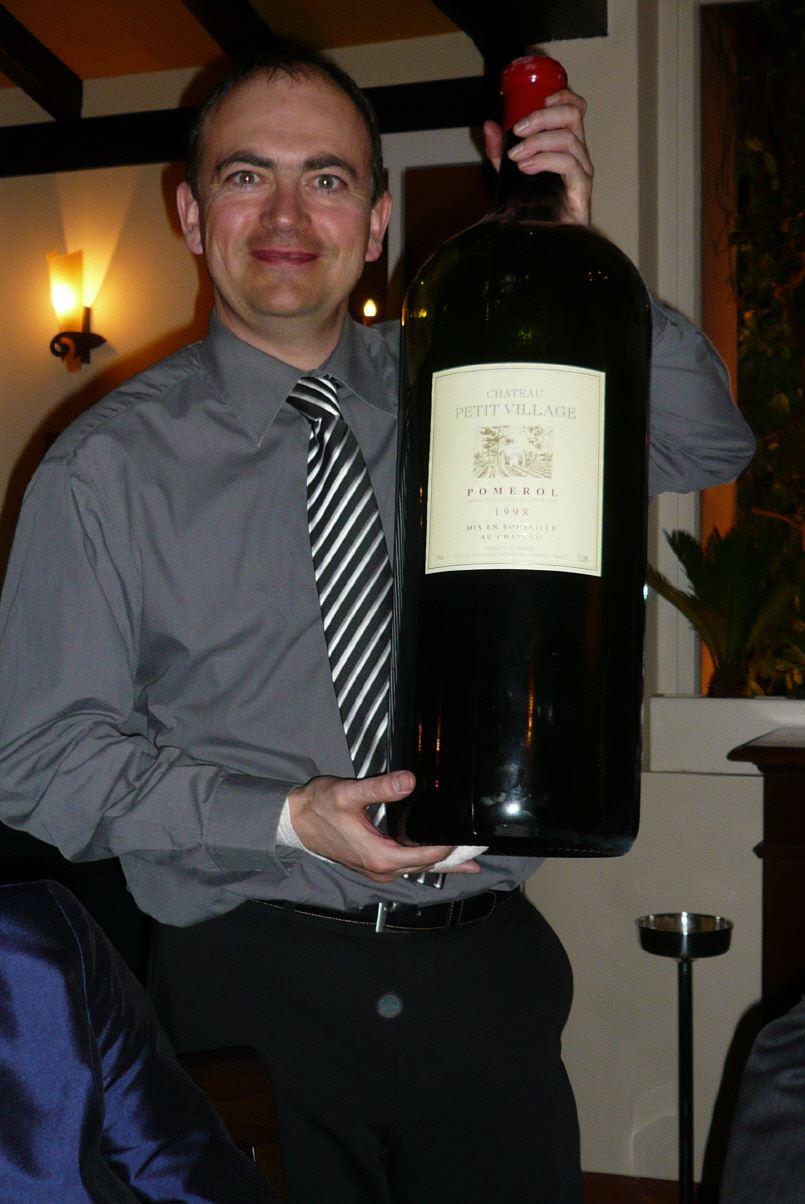 Martin Dalsass, der beste Koch des Tessins erwartete uns am zweiten Abend in seinem Restaurant Santabondio in Sorengo-Lugano. Hier wurden wir nicht nur hochklassig bekocht. Es gab mit der 15 Liter Nebuchadnezar 1998 Petit Village auch reichlich Mengen eines sehr spannenden Tischweins. Pflaumig, schokoladig mit Kaffee und Rüstnoten, sehr fleischig, dicht und auch etwas rustikal, lakritzig im Abgang. Kann sicher noch zulegen, und war aus diesem herausragenden Pomeroljahr auch ein guter Sparringspartner für die Le Pins auf 90/100 Niveau. Gut möglich, dass diese Riesenflasche billiger war als so manche Le Pin Eintel.