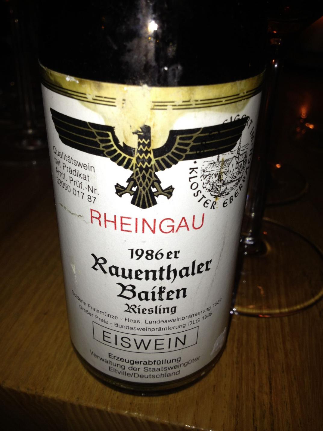 Mit einer weiteren Paukenschlag schloss unsere Verkostung, dem legendären "Herrenbaiken". So tauften wir seinerzeit den 1986 Rauenthaler Baiken Eiswein #17 Versteigerung von den Staatsweingütern Eltville, von dem es auch noch eine etwas kleinere Version, den "Volksbaiken" gab. Der "Herrenbaiken" machte Anfang der Neunziger in diversen Proben insbesondere Fans großer und größter Sauternes eindrucksvoll klar, wo der Hammer wirklich hängt. Mit güldener Farbe, einem Pfauenrad an Aromen und der intensiven Säure großer Eisweine blieb er minutenlang am Gaumen 99/100.