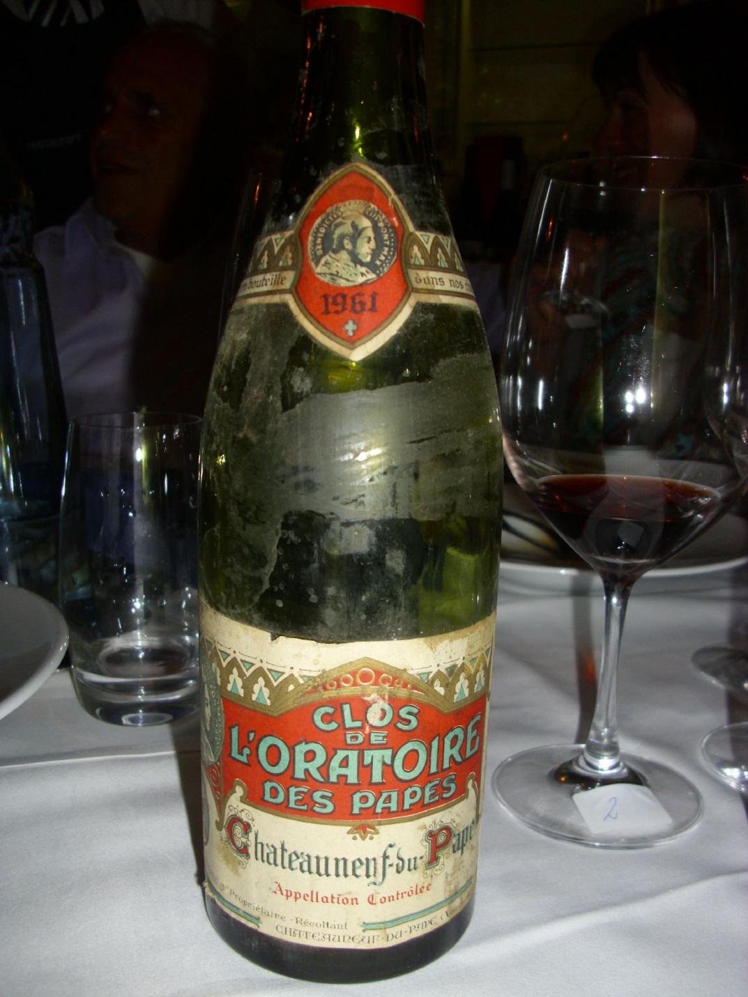 Der kam gar nicht erst auf den Tisch, dieser 1961 Chateauneuf-du-Pape von Poulet. Beim Versuch des Öffnens sauste der Korken sofort in die Flasche und die Nase des Weines verhieß trotz dichter Farbe nichts Gutes. Sollte also das an der nördlichen Rhone so großartige Jahr 1961 in Chateauneuf soviel schlechter gewesen sein? Reichlich schlechte dieser 61er Chateauneufs hatte ich ja erst eine Woche vorher auf René Gabriels großer 61*61 Probe getrunken. Und zu gut hatte ich noch Renés Worte im Ohr, einen guten 61er Chateauneuf müsste ich ihm erst noch bringen. Schade, dass er beim nächsten Wein nicht neben mir saß. Der 1961 Chateauneuf-du-Pape Clos de l Oratoire war nicht nur groß, das war ein Gigant. Traumnase, süß, kräuterig, vielschichtig, Kraft und immer noch Jugend zeigend. Sehr komplex mit ungeheurem, aromatischem Druck am Gaumen, wiederum mit generöser Süße und unglaublicher Länge 97/100. Hätte sich auch gut als Pirat in einer Lafleur-Probe gemacht. Dem René habe ich gleich ein SMS mit Foto und Bewertung geschickt.