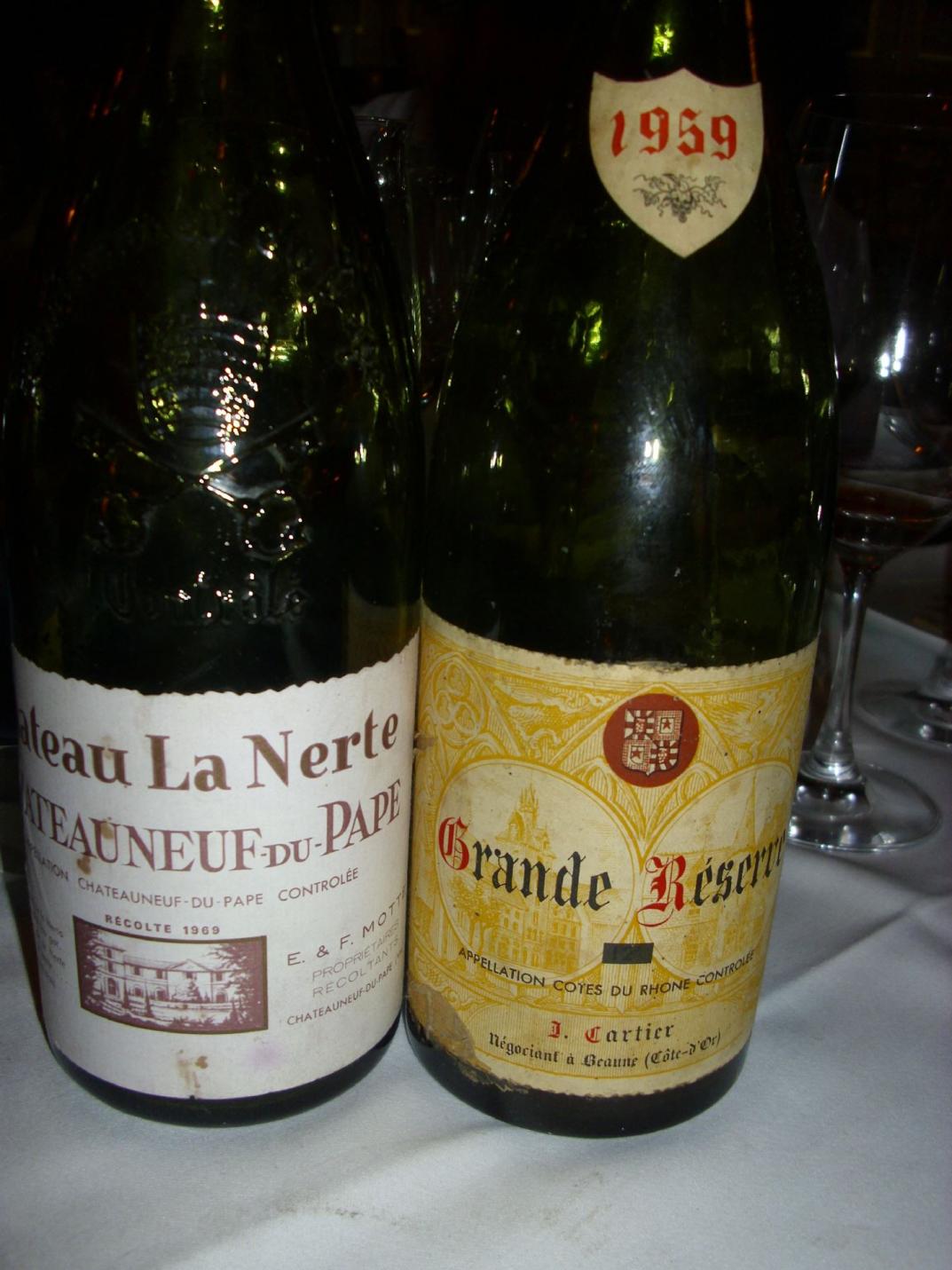 Am Vorabend in der Chateauneuf-Probe war die Flasche 1969 Chateauneuf-du-Pape Les Cadettes von La Nerthe geöffnet und für nicht trinkbar befunden worden. Jetzt, 24 Stunden später, war die Nase zwar immer noch etwas schwierig, aber was für ein feiner Tropfen am Gaumen, so süß, so expansiv, so aromatisch, so lang, einfach nur schön und mit besserer Nase wären da noch deutlich mehr als 93/100 rausgekommen. Als Absacker dann noch eine Flasche 1959 Côtes du Rhone Grande Reserve von Cartier. Gering die Erwartungen, umso größer die Überraschung. Was für ein wunderbarer Wein mit herrlicher Kaffeenase, Korinthen feiner Süße, am Gaumen noch so frisch, erdig mit viel Kraft und Länge 94/100. Hat mit dem, was heute so unter dem Label Côtes du Rhone angeboten wird überhaupt nichts gemeinsam.