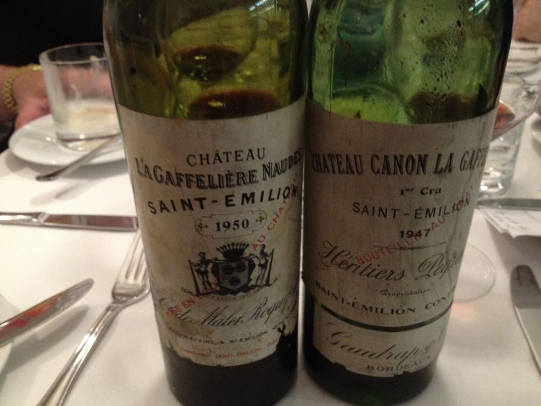 Und damit kamen wir zum Rotweinflight des Abends. Blind hatten wir zwei große Cheval Blanc im Glas. 1950 Gaffelière-Naudes, dieser Cheval Blanc für Schlaue überzeugte mit seidiger Eleganz, mit verschwenderischer Süße, druckvoller Aromatik am Gaumen und großartiger Länge, baute enorm aus im Glas und legte immer mehr zu 98/100. Ich kaufe alte Gaffelière-Naudes wo immer ich sie finde, denn die waren damals auf Augenhöhe mit Cheval Blanc. Eine tiefe, dunkle Farbe hatte 1947 Canon-la-Gaffelière aus einer perfekten Flasche, vollbusig, sexy, generöse Süße, die portige Dichte von 47 Cheval Blanc, noch soviel Kraft, so jung, so immens lang, der schiere Wahnsinn 99/100. Für mich und auch für Stephan Graf Neipperg die bisher beste Flasche dieses Weines.