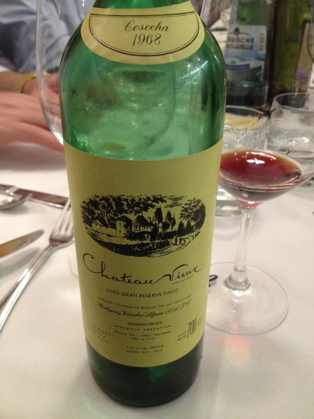 Aus seinem Jahrgang gäbe es außer ein paar Spaniern nichts vernünftiges, hatte mir Roman Niewodniczanski versichert. Da musste natürlich diese Flasche hier dran glauben. 1968 Chateau Vieux Vino Gran Reserva Tinto von den Bodegas y Vinedos Lopez aus Maipu-Mendoza in Argentinien war ein großer, reifer Malbeck mit nur einem Hauch flüchtiger Säure, der kaum Alter zeigte. Ging am Tisch als großer Bordeaux aus 55 oder 59 durch 94/100. Natürlich ruderte der ein oder andere am Tisch zurück, als der Wein aufgedeckt wurde, outete sich damit aber höchstens als bekennender Etikettentrinker. Das ist ja gerade das spannende bei Blindproben, dass auch ein namenloser Wein bei entsprechender Qualität die ihm sonst sicher verwehrte Chance auf den Punkte-Jackpot hat.