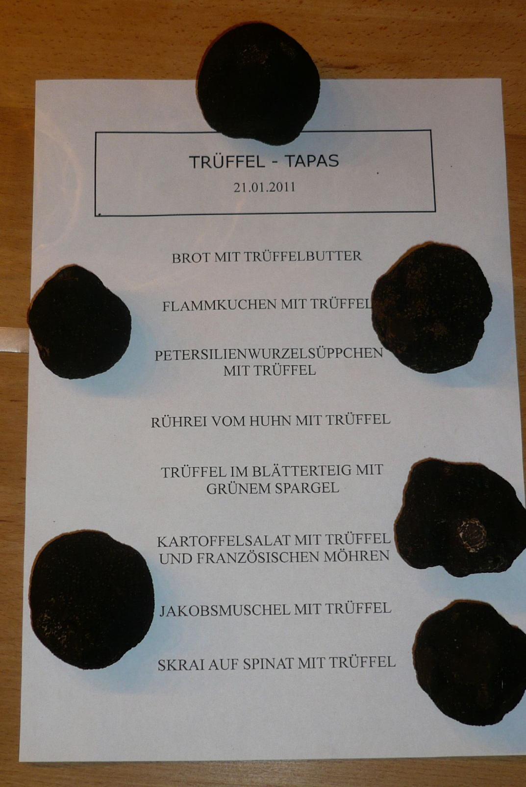 Ich liebe diese Knollen, insbesondere die schwarze, die aus Perigord. Aber wenn dann im Restaurant der Mensch mit dem weißen Handschuh und der Briefwaage kommt, dann wird mir ganz anders. Da kann man angesichts er aufgerufenen Kurse nicht schnell genug Stopp rufen. Ganz anders bei unserem jährlichen Trüffelmenü. Unser "Privatsternekoch" Bernd hatte über einen Importeur tagesfrische Trüffel in allerbester Qualität besorgt, die vielleicht besten der letzten Jahre. Daraus zauberte er uns ein geiles Menü mit Trüffel satt.