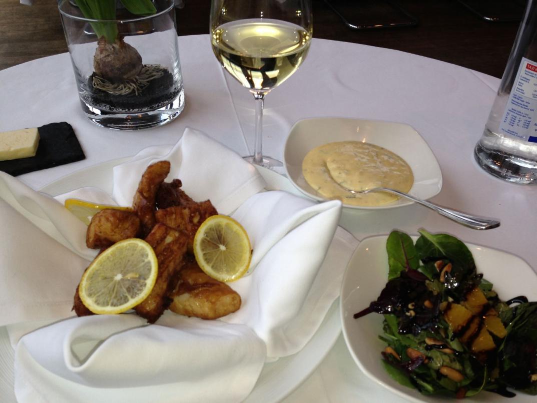 Das Einfachste ist immer das Beste. Draußen schifft es ohne Ende, drinnen in Düsseldorfs "schönster Kantine", dem Berens am Kai, gibt es als schnellen Mittagsgang genialen Backfisch vom Steinbutt mit Remouladensoße. Dazu ein Glas des knackigen 2011 Rheingauer Charta Rieslings von Spreitzer. Und schon ist die Welt wieder in Ordnung.