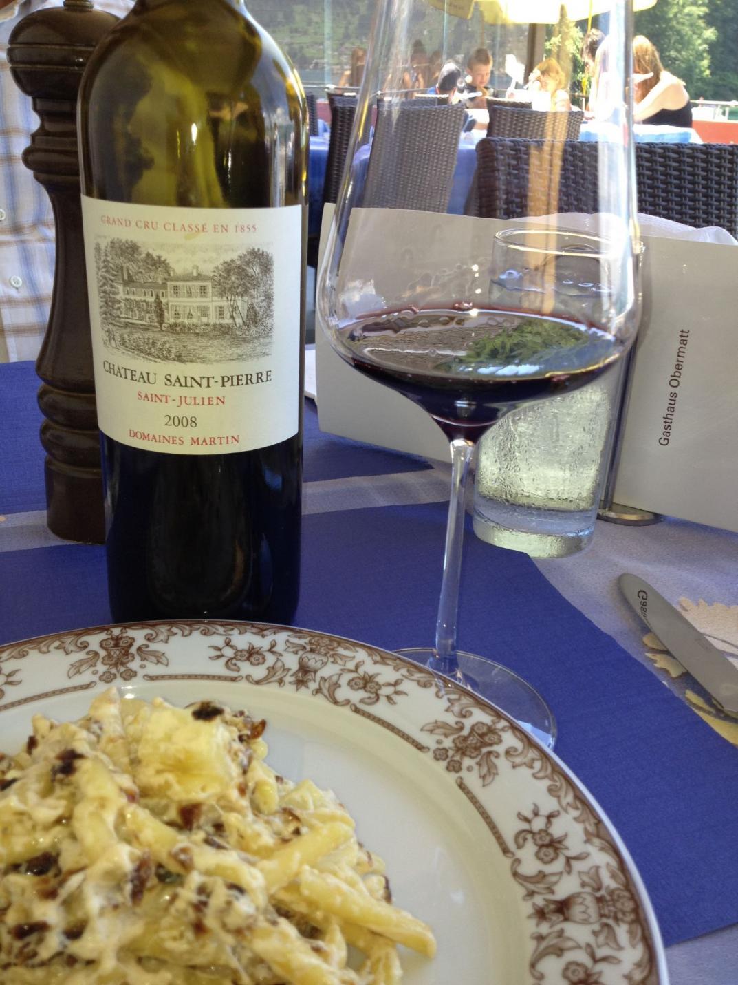 Natürlich hat so ein Innerschweizer auch mittags Hunger. Da fährt er dann mit dem Boot nach Obermart und gönnt sich die Weltklasse-Älplermagronen, zu denen der prächtige 2008 St. Pierre aus St. Julien wie Pott auf Deckel passt. Tiefdunkle Farbe, animierende, jugendliche Röstaromatik, reife, schwarzbeerige Frucht, rauchig, mineralisch, voll und lang am Gaumen 94/100. Angeblich lebt ja der liebe Gott in Frankreich. Das ist nur ein Gerücht, der lebt hier.