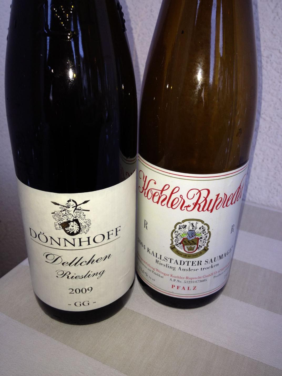 Den Auftakt unserer diesjährigen Sause machten zwei Rieslinge aus der schier unerschöpflichen Karte des Parkhotels. Traumhaft balanciert Riesling das 2009 Dellchen GG von Dönnhoff, sehr mineralisch, nachhaltig, aber auch elegant, nur ist das in 2009 kein filigranes Dellchen mehr, wie in früheren Jahren, das ist ein ausgewachsener Dell! Bleibt ewig am Gaumen und kann noch zulegen 94+/100. Die 2004 Kallstädter Saumagen Auslese trocken "R" von Koehler-Rupprecht startete verhalten mit dezenter Petrolnase, explodierte dann aber förmlich. Ein blutjunger Gigant mit Zukunft ohne Ende, burgundisch im besten Sinne, extrem präzise Frucht, weißer Weinbergpfirsich, sehr mineralisch, Muschelkalk, enorm tiefgründig und lang 95+/100.
