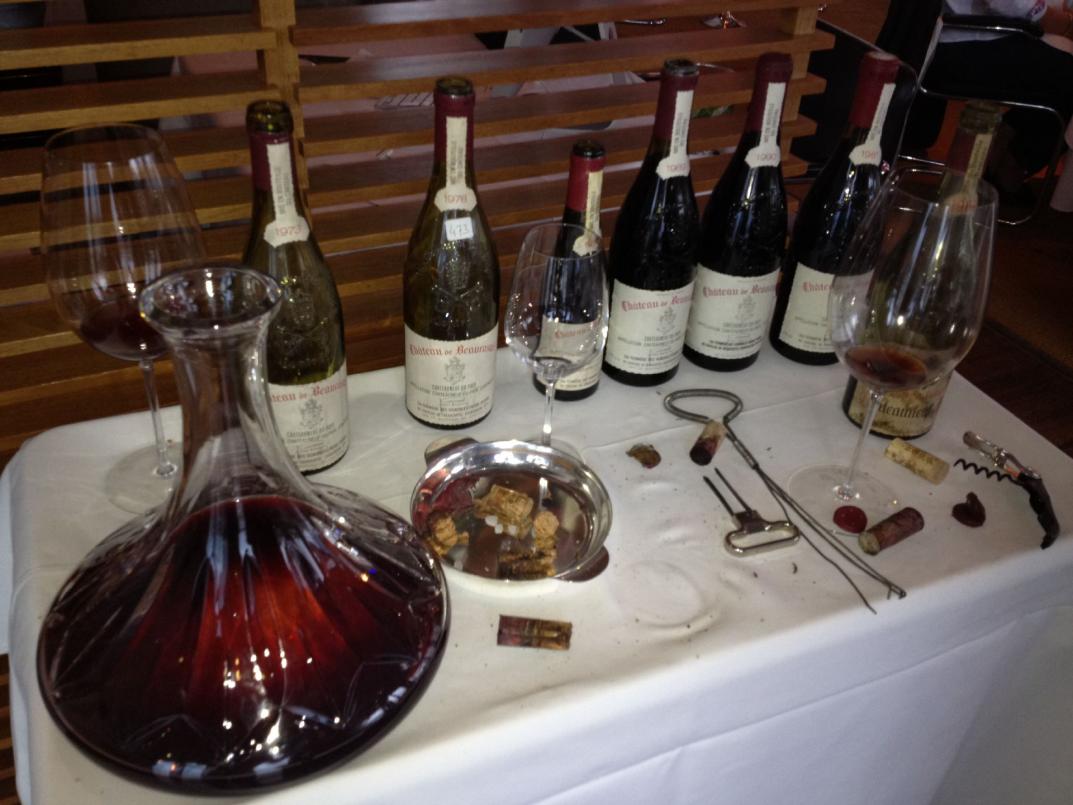Den Anfang machte der vermeintlich schwächste Wein, 1973 Beaucastel. Der hatte zwar eine reife Farbe, war aber noch so vital und lebendig. Kräuter pur, Riccola, teerig, lakritzig, immer noch enorm kräftig und lang, aber auch mit burgundischem Charme und malziger (Guiness)Süße, hielt sich über lange Zeit im Glas und baute sogar etwas aus konservative 93/100. Deutlich reifer, weicher und mit weniger Druck der burgundisch-elegante, sehr feine 1964 Beaucastel aus Holger Berens Geburtsjahr, der im Glas enorm ausbaute 92/100. Sehr jung noch die Farbe des 1978 Beaucastel, traumhafte Nase mit Erdbeere und reifer Himbeere, am Gaumen so dicht, so packend, immer noch mit deutlichem Tanningerüst und langer Zukunft 93+/100.