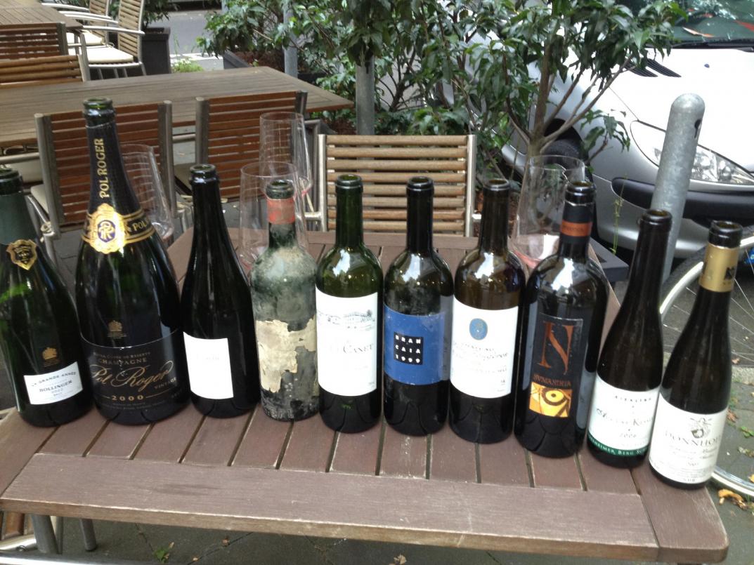 Jetzt wäre der richtige Zeitpunkt gewesen, zu gehen. Aber Toni erinnerte mich an einen 1928 Bellevue aus St. Emilion in einer deutschen Abfülling, den ich von einer früheren Probe noch hier liegen hatte. Also musste da unbedingt noch der Korken raus. Voll intakte Farbe, spannende Nase mit viel Tabak und dunklem Toffee, wird medizinal, geht weg wird lakritzig, sogar noch Fruchtreste, am Gaumen erstaunlich stabil mit guter Säure und 28er Tanninen, steht gut im Glas und baut nicht ab 92/100. Dicht die Farbe des 2003 Pontet Canet, enorme Kraft, viel Tannin, versteckte Frucht, sollte das ein langlebigerer 2003er sein? Macht derzeit wenig Freude 89/100. Gut gelungen der 1999 Brancaia IGT mit gutter Struktur und Säure 90/100. Vollbusig und sexy der 1999 Péby Faugères mit pfaumiger Frucht, Fülle und Kraft 93/100. Groß der 1999 Numanthia, würzig, mineralisch mit hoher Extraktsüße und gewaltiger Länge 95/100. Eine wunderbare Honignase zeigte die 2004 Riesling BA von August Kesseler mit feiner, schmelziger Süße und guter Säure 93/100. Noch taufrisch mit toller Säure und großer Zukunft die 2007 Oberhäuser Brücke AGK von Dönnhoff 92+/100.