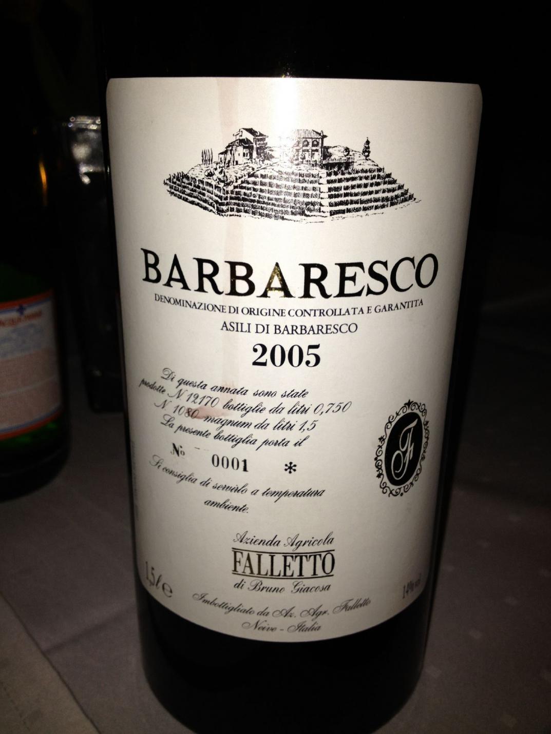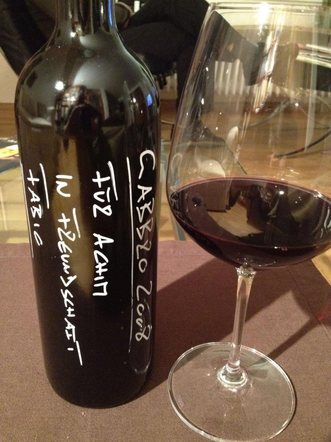 Auch das war eine Premiere, im März draußen vor dem Saittavini, Sommerfeeling noch vor Frühlingsanfang. Den 1991 Regaleali Chardonnay, den mir Michelangelo kredenzte, schien das irgendwie beflügelt zu haben. Erstaunlich präsent noch, dieser Wein, der mächtig im Glas zulegt, nussig und mit feiner Kräuternote 89/100. Traumhaft schön danach der saftig-komplexe 2009 Malterer von Huber, kräftig, lang und erst ganz am Anfang, geht blind auch als Burgunder durch 93/100. Ich bin seit langen Jahren ein großer Fan dieser Cuvée aus Weißburgunder und Freisamer. Allein die Flasche selbst, um die sich die Abbildung eines alten Wandteppichs, des Malterers, schlängelt, ist schon sehenswert. Erstaunlich weich, offen und elegant zu Anfang der 2005 Barbaresco Falletto von Bruno Giacosa mit kräuterig-lakritziger Nase und Veilchen, auch am Gaumen erst offen, doch mit der Zeit schleichen sich immer mehr die mächtigen Tannine an 92/100. Bass erstaunt war ich, als ich auf der Flasche entdeckte, dass wir die Nr. 0001 tranken. Hatte ich noch nie.