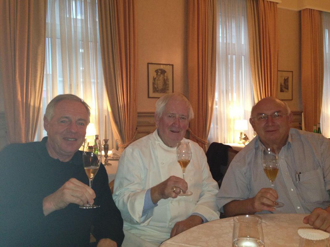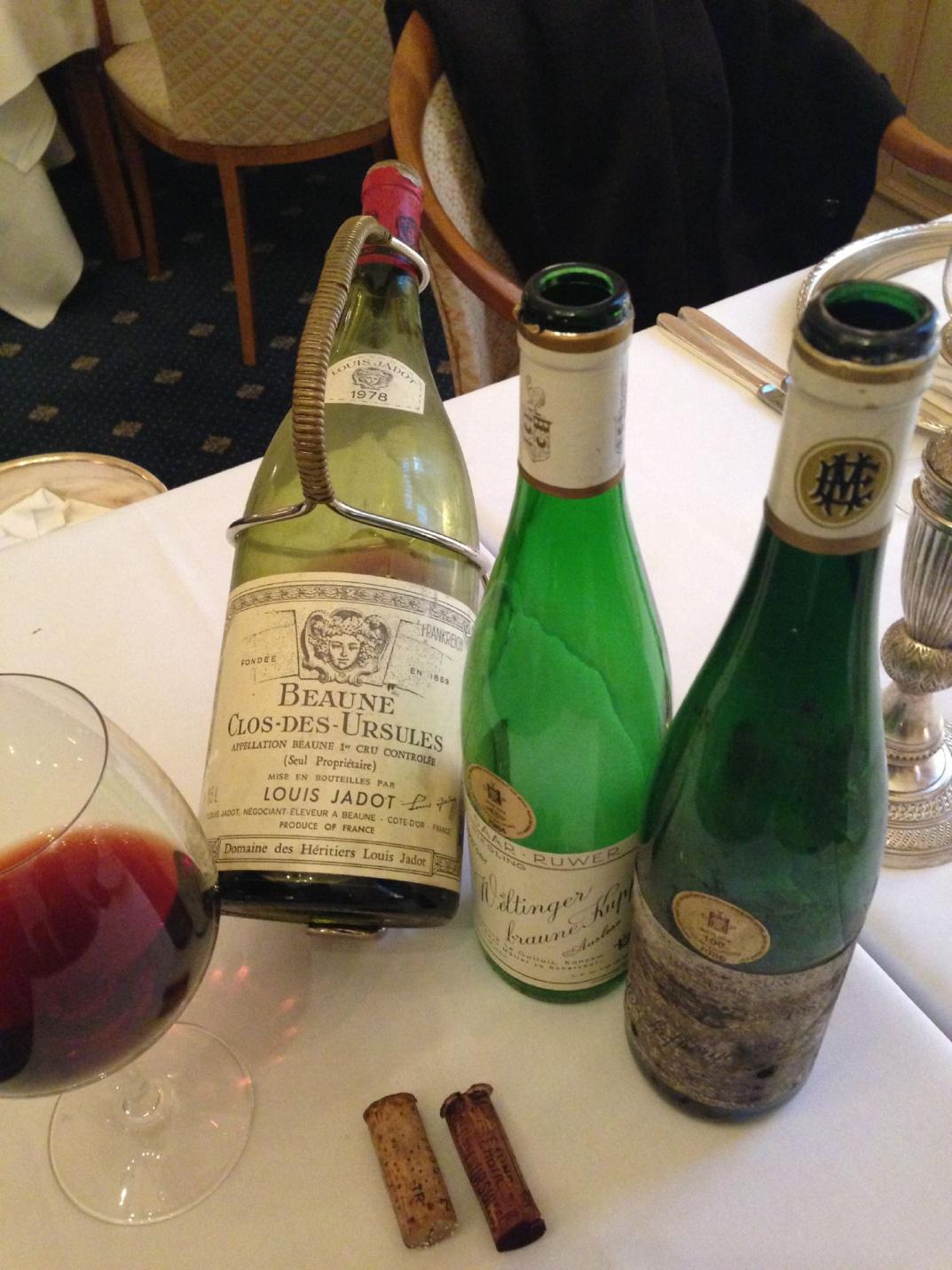 Grosses Burgunderkino war dann aus der Magnum der 1978 Beaune 1er Cru Clos des Ursules von Jadot. Wir hatten uns hier auf Herrn Kaufmanns Urteil und seinen Ratschlag verlassen. Mit einem sehr guten Wein hatte ich gerechnet, aber nicht mit dieser Klasse. Es macht schon einen gewaltigen Unterschied, ob solch ein Wein ein paar Jahre im Regal eines Händlers verbracht und danach vielleicht noch zwei Besitzer gesehen hat, oder ob er, wie hier, 1980 erworben wurde und seitdem unberührt im Weinkeller gelegen hat. Noch so jung und vibrierend war dieser Wein mit tiefer, altersfreier, brillianter Farbe, mit herrlicher Frucht, reifer Herzkirsche, und Mokkanoten. Dazu eine gute Struktur mit dem dazugehörigen Säuregerüst und feiner, süßer Schmelz, blieb sehr lang am Gaumen 95/100. Fantastischer Abschluss eines großartigen Lunches der immer noch rassige, perfekt gereifte 1971 Champagner Pol Roger Reserve Special. Auch das eine perfekt gelagerte, nie bewegte Flasche. Das verhaltene Mousseux nur noch leicht am Gaumen spürbar, klar, dass war mehr Wein als junge Krawallbrause, aber was für ein Wein! So komplex, so faszinierend und lang am Gaumen, da sind meine konservativen 95/100 schon fast eine Beleidigung. Die Traube mit ihren heiligen Hallen und der fantastischen, klassischen Küche ist nach wie vor jede Reise wert, und Fans gut gereifter Weine und Champagner werden sich hier wie im Paradies fühlen. Was Dieter Kaufmann, der dazu ein sehr charmanter Gastgeber ist, hier mit seinen kaum merkbaren 75 Jahren auf die Beine stellt, verdient uneingeschränkte Bewunderung.