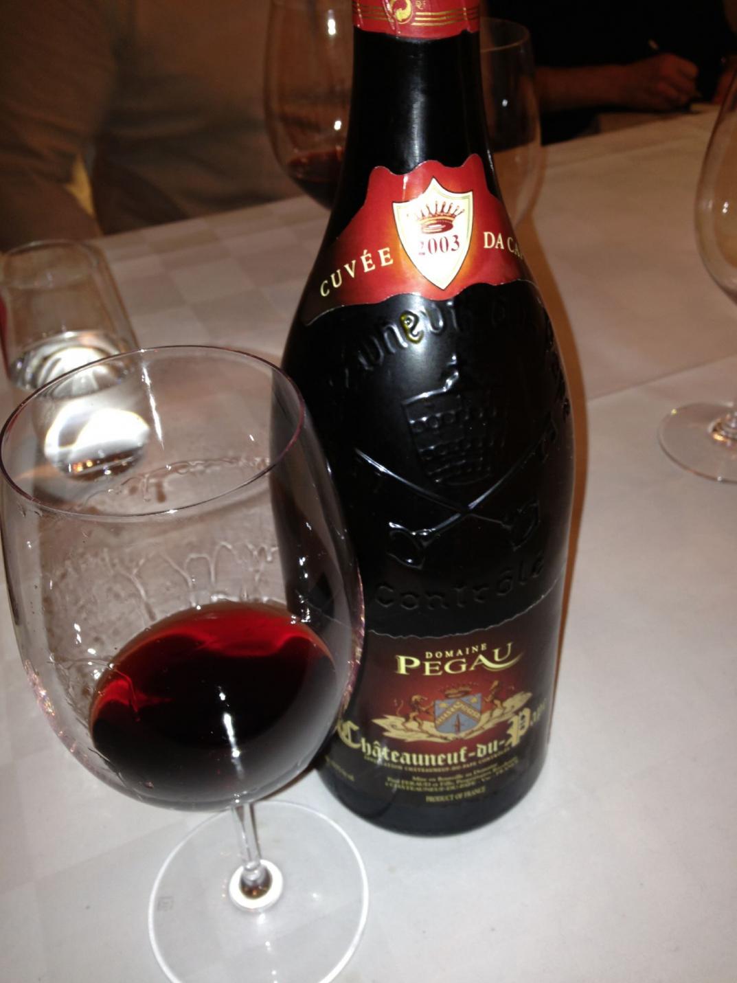 Atemberaubend, was danach ins Glas kam. Erst war ich bei den größten, jungen Bordeaux, dann bei Harlan und landete beim Ausflug über die größten Weine der Welt, als praktisch alles andere ausgeschlossen war, bei 2003 Chateauneuf-du-Pape Da Capo von der Domaine Pegau. Einfach ein riesengroßer, perfekt strukturierter, sehr balancierter Wein, bei dem alles stimmt. Mit Parkers 100/100 kann ich mich voll identifiziere. Von der Papierform her hätte das mit 16,1% Alkohol ein Monstrum sein müssen, war es aber nicht. Davon den großen Schluck, den uns allen die Magnum garantierte, das war Faszination pur. Und diesen enormen Alkohol so zu verstecken und zu verpacken, dass man ihn erst (zu) spät merkt, das ist schon meisterlich. Aber ein gut gefülltes Glas reicht auch. Wer davon eine ganze Flasche trinken möchte, sollte sich vorher ein Schild umhängen, auf dem steht, wo er später abgeliefert werden möchte. Und zart besaitete Engländer bleiben besser gleich ganz weg, so wie Neil Martin. "Not my cup of tea" schreibt der auf Parkers Website und gibt 90/100.