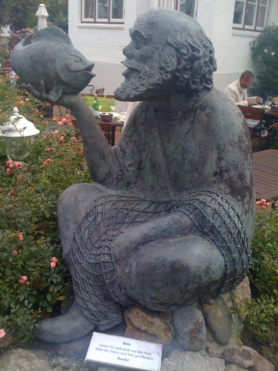 In List hat es uns der 200 Jahre alte Gasthof angetan. Spezialität der guten Küche sind Hummer Helgoländer Art und Fischgerichte. Da von Mittag an durchgehend geögffnet ist, lässt sich hier im lauschigen Garten hervorragend ein spätes Mittagessen zelebrieren, was wir mehrfach taten. In Erinnerung wird uns vor allem ein Lunch an Wineterminators Geburtstag bleiben. Wir hatten, trotz ungewisser Witterung um einen Tisch draußen gebeten. Den bekamen wir auch, und da es leicht nieselte, wurde ein großer Sonnenschirm geöffnet. Kaum hatten wir Platz genommen, da ging es auch schon los. Ein massives Gewitter zog über die Insel mit reichlich Blitz und Donner. Dazu schüttete es zwei Stunden lang wie aus Kübeln. Doch unser Schirm hielt und wir genossen ein Essen der besonderen Art. Als ersten Wein wählten wir einen 2003 Redoma Branco Reserva von Niepoort aus Portugal. Ein sehr erstaunlicher wein, den ich so nicht erwartet hatte, kräftig, mineralisch, frisch mit guter Säure, nussige Röstaromatik, an einen großen Burgunder erinnernd, perfekter Essensbegleiter 92/100. Weiter ging es mit einem 2002 Trilogia von Kokkalis, exotisch, fruchtig, lecker, hedonistischer Trinkspaß auf hohem Niveau 92/100.