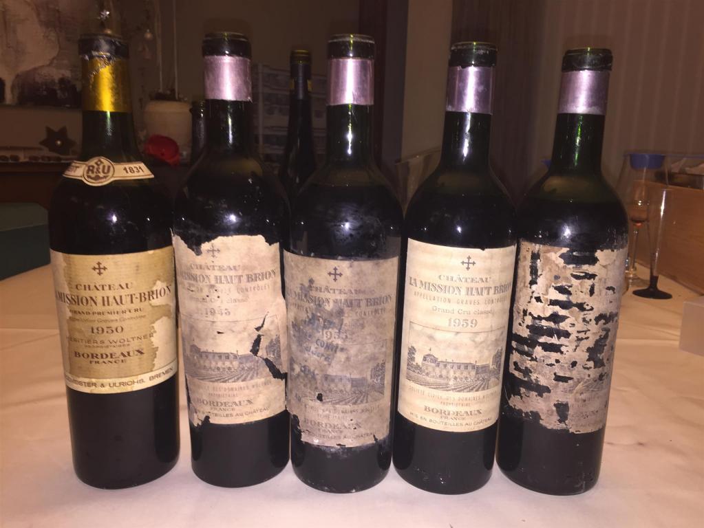 Und was dann kam, gehört zu den absoluten Höhepunkten im Leben eines Weintrinkers. La Mission Haut Brion gehört nicht nur zu den Superstars aus Bordeaux. Es ist auch eines der zuverlässigsten Chateaus selbst in kleinsten Jahren. Aber wenn dann von diesem Chateau die großen Klassiker ins Glas kommen, dann ist der Rotweinhimmel voller Geigen. Da punktete mit diesem herrlichen 1950 La Mission in einer deutschen R&U Abfüllung endlich auch mal Wineterminators Geburtsjahr. Intakt nicht nur die Farbe, klassisch La Mission und Pessac die Nase mit Tabak, Cigarbox, frisch aufgebrühtem Kaffee und malziger Süße, diese Süße dann auch wieder am durchaus noch recht kraftvollen Gaumen – WT98. Schwierig die Nase des 1953 La Mission, die deutlich oxidativ wirkte, doch prächtig der Gaumen mit enormer Kraft und betörender Eukalyptussüße, der Gaumen alleine locker WT96, mit besserer Nase wäre da noch deutlich mehr drin gewesen. Das kam dann mit dem schlichtweg perfekten 1955 La Mission bei dem von der altersfreien Farbe über die perfekte Pessac-Nase und den trotz enormer Kraft und Dichte erstaunlich eleganten Gaumen und die gewaltige Länge alles stimmte. Ein Wahnsinnswein zum „allen Nachbarn die Gläser klauen“ – WT100. Und das setzter sich so fort. Perfekt und schlichtweg ein Traum 1959 La Mission, der einfach alles von allem hatte – klare WT100. Das galt auch für den sehr kraftvollen, monumentalen 1961 La Mission, für mich wieder (wie schon so oft) klare WT100. René fand in diesem Wein einen Fehler und hat ihn nicht bewertet. War ich zu berauscht? Ich fand diesen Wein einfach gigantisch gut. Der einzige Fehler bestand für mich darin, dass in meinem Glas zuwenig war. Den mal zu zweit aus der Doppelmagnum, das wärs.
