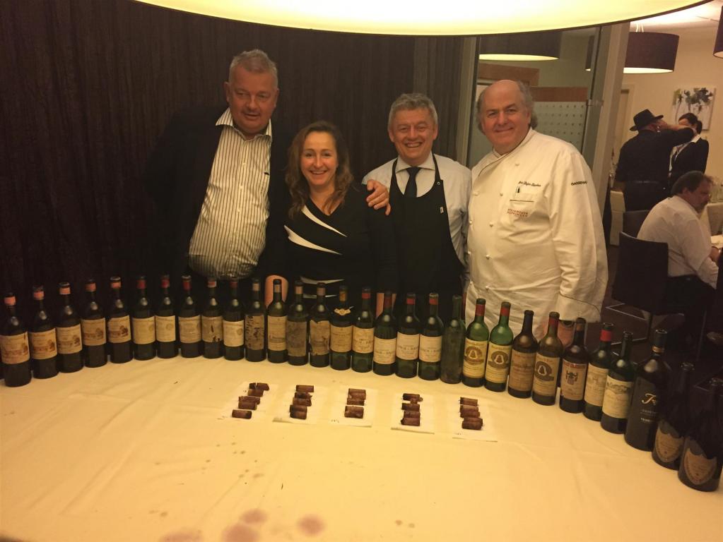 Wenn da ein Chateau mithalten konnte, dann war das Cheval Blanc. Und Cheval Blanc hielt mit, das war der helle Wahnsinn. Eine meiner bisher besten Flaschen des 1950 Cheval Blanc, Cheval in Perfektion, noch so vital und voll da, Traumfrucht, perfekte, einfach irre Nase, überhaupt nichts oxidatives, einfach nur Finesse und superbe Eleganz, ein perfekter, stimmiger Wein – WT100. Der 1953 Cheval Blanc wirkte etwas reifer als der 50er, war aber ebenfalls an Eleganz und Stimmigkeit nicht zu überbieten, einfach wieder großer, reifer Cheval Blanc, Cashmere für Gaumen und Seele – WT100. Für René Gabriel, der praktisch neben mir saß, waren beide Weine deutlich über den Höhepunkt und „vorbei“. Und warum hat er dann seine Gläser ausgetrunken und nicht in meine geschüttet? Lieber René, schick mir alles, was Du noch an 50 und 53 Cheval im Keller hast. Ich entsorge die Flaschen kostenlos durch meinen Gaumen und zahle auch das Porto. Du kannst gerne auch den 1955 Cheval Blanc mit dazu packen. Auch den fand ich außerirdisch gut und schlichtweg perfekt. Was für eine irre Nase mit wunderbarer, leicht portiger Frucht, was für eine Eleganz, Fülle und Länge am Gaumen, einfach Weltklasse – WT100. Da musste man erstmal Luft holen. Sechs absolut (für mich) perfekte Weine in einer Reihe, das war der helle Wahnsinn. Was für ein irres Fest für die Sinne. Für solch eine Serie würde ich um den halben Erdball fliegen. Und dann waren da noch zwei weitere Cheval Blancs. Der 1959 Cheval Blanc wirkte auf hohem Niveau etwas überreif (überlagert?) und etwas hohl am Gaumen – WT95. Sehr schön und immer noch sehr jung und kräftig wirkend der 1961 Cheval Blanc, kräuterig, füllig mit generöser Süße und guter Länge – WT96.