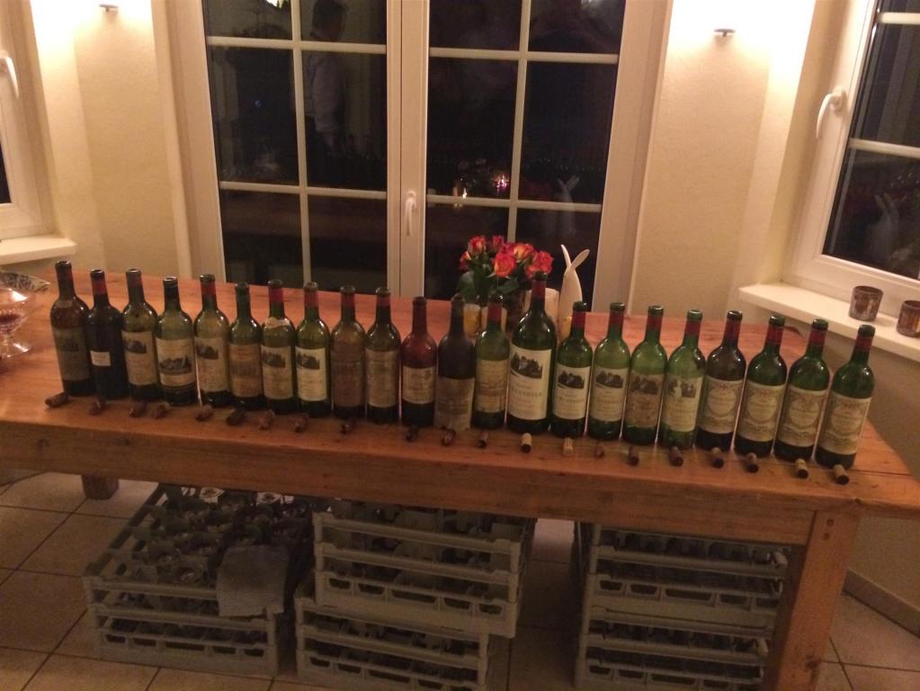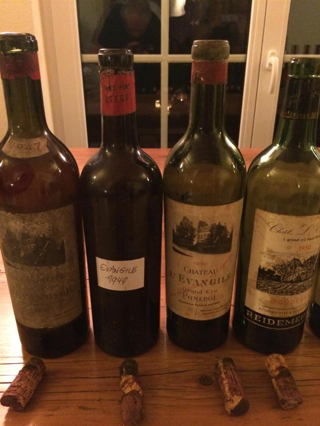 Woran erkennt man, ob ein großer, alter Wein gut gelagert wurde? Am besten und einfachsten natürlich, wenn man ihn direkt aus dem Originalkeller erwerben kann, in dem er seit Kauf unberührt gelegen hat. As dürfte inzwischen in den seltensten Fällen möglich sein. Bleiben als Indizien noch Füllstand und Farbe. Doch bei Letzterer ist Vorsicht angesagt. Ist die Farbe zu dicht und geht schon Richtung Schwarz, dann ist Vorsicht angesagt. Hier ist der Wein dann oxidiert. Zwei solcher Flaschen hatten wir jetzt vor uns. Mit eben dieser vermeintlichen Superfarbe kam der 1945 Clos l´Eglise Clinet ins Glas. Fürchterliche Nase mit Fehltönen und reichlich Möbelpolitur, dazu flüchtige Säure ohne Ende. Kaputt, hin, schade. Das galt leider auch für den 1950 Clos l´Eglise Clinet, bei dem zudem noch vor einiger Zeit der Korken in die Flasche geflutscht war. Auch hier wieder diese superdichte Farbe, flüchtige Säure und Essig am Gaumen. Aber auch spürbare Kraft und Substanz. Also beide Weine eine Suche wert. Wer sie findet, darf sie gerne mit mir trinken. Ich stelle etwas Äquivalentes dagegen.