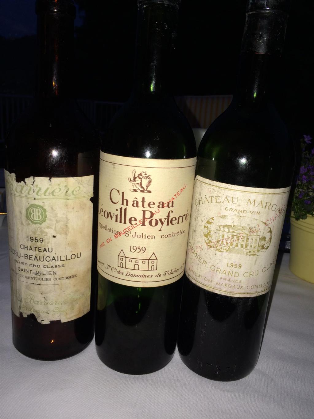 Die Überraschung des Abends war für mich 1959 Ducru Beaucaillou in einer französischen Barrière-Abfüllung. Nicht zu Unrecht fielen hier am Tisch – wir verkosteten alle Weine blind – große Namen. Diese Ausnahmeflasche schienen wir just in diesem einen Moment zu genießen, wo der Wein über sich hinauswächst. Wunderbare Frucht, generöse Süße, Fülle, Länge, einfach absolut stimmig und ohne die nicht nur bei diesem Wein so oft störende 59er Säure – WT97. Was würde ich darum geben, wenn dieser „Magic Moment“ auf der Flasche vorher angezeigt würde. Auch 1959 Léoville Poyferré zeigte sich sehr fein, elegant und absolut stimmig mit sehr guter Länge – WT94. Sicher hätte 1959 Margaux hier mithalten können, aber der hatte leider Kork.