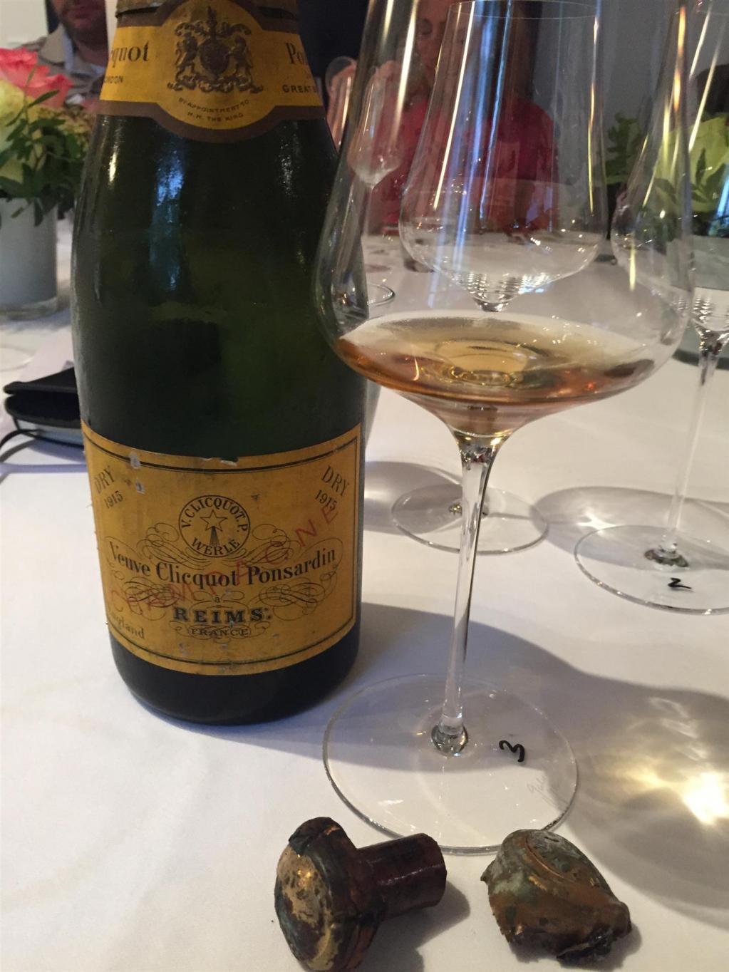 Und dann starteten wir gleich mit vollem Risiko in die Probe mit einer Flasche, vor deren Performance ich den meisten Bammel hatte. Wie würde 100 Jahre alter Champagner schmecken? Der 1915 Veuve Clicquot Ponsardin Dry aus einer wohl damals für den englischen Markt vorgesehenen Flasche war optisch und vom Füllstand her in gutem Zustand. Schrumpelig der uralte Originalkorken, den Oliver Speh, unser perfekter Maitre de Plaisir, mit sicherer Hand löste. Hell gülden aber klar die Farbe, kein Mousseux mehr, aber auch keine Alterstöne. Wunderbare Aromatik, Brioche mit frischen Waldpilzen, immer noch gewisse Frische zeigend, am Gaumen enormer Tiefgang mit feiner Bitternote im Abgang. Der Weinbuchhalter in mir würde jetzt für diesen traumhaft aromatischen Stillwein WT94 geben, der Weinliebhaber aber gibt für dieses einmalige Erlebnis WT100.