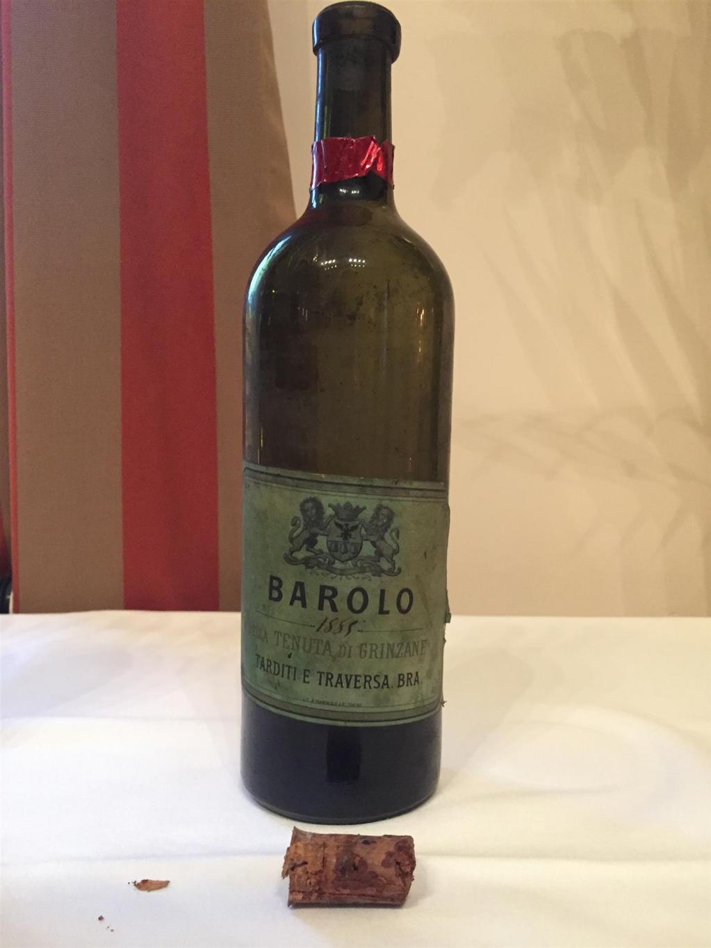 Und dann war als Solitär der Senior dieser Probe dran, ein 130 Jahre alter 1885 Barolo der Tenuta di Grinzane. Helle, immer noch brilliante Rosé-Farbe, feine, pikante, himbeerige Frucht, immer noch Frische zeigend, wofür natürlich die massive, aber nicht unangenehme und tragende Säure verantwortlich war. Dieser Barolo stand noch voll im Glas und war voll intakt. Ja, das war noch Trinkgenuss auf WT93 Niveau. Oder, wie es ein Weinfreund aus der Schweiz formulierte: „Der ist so sanft wie der Beischlaf eines pensionierten, 80jährigen Generals“. Für das Erlebnis eines so alten Weines gilt analog das zum 1915 Veuve Clicquot Geschriebene. Und zur Flasche selbst: die war weder neu verkorkt noch sonst irgendwie aufgehübscht und hatte noch den alten, schrumpeligen Originalkorken.
