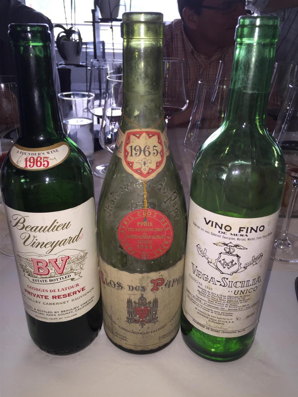 Und damit waren wir dann schon im Jahrgang des Geburtstagskindes, der ja nun wirklich nicht gerade zu den prickelnsten Weinjahrgängen des letzten Jahrhunderts gehörte. Aber Marcel hatte mit Gespür und natürlich auch Glück drei sehr gut trinkbare Weine gefunden. Leicht anstrengen zu Anfang die oxidative Nase des 1965 Beaulieu Private Reserve Georges de Latour, am Gaumen gute Frucht, aber auch massive Säure, sehr gute Länge. Erstaunlich, wie sich dieser Wein entwickelte. Wurde immer minziger, weicher und trinkiger – WT90. Auch der 1965 Clos des Papes, bei dem zu Anfang vor allem die schwierige Nase mit Schuhcreme störte, legte enorm zu und wurde am Gaumen immer gefälliger, süßer und burgundischer – WT92. Sicher jede Suche wert. Fehlerlos und in sehr guter Form zeigte sich der 1965 Vega Sicilia Unico. Das war einfach ein geiles Teil mit flüssiger Minze in Bitterschokolade, mit guter Frucht, Süße und Länge – WT94. Das entspannte Lächeln auf dem Gesicht unseres Gastgebers zeigte, dass auch er mit diesem Flight mehr als zufrieden war.