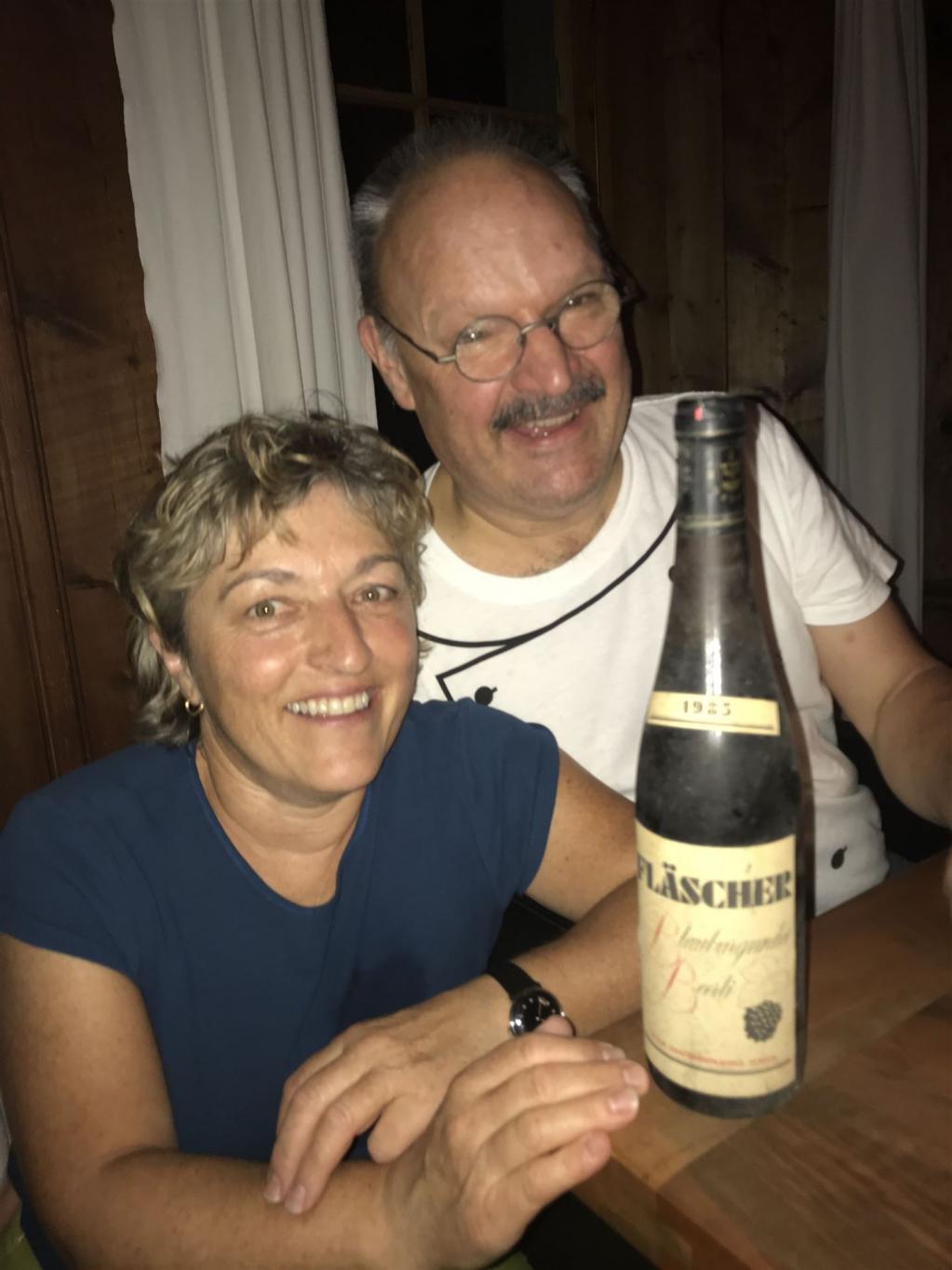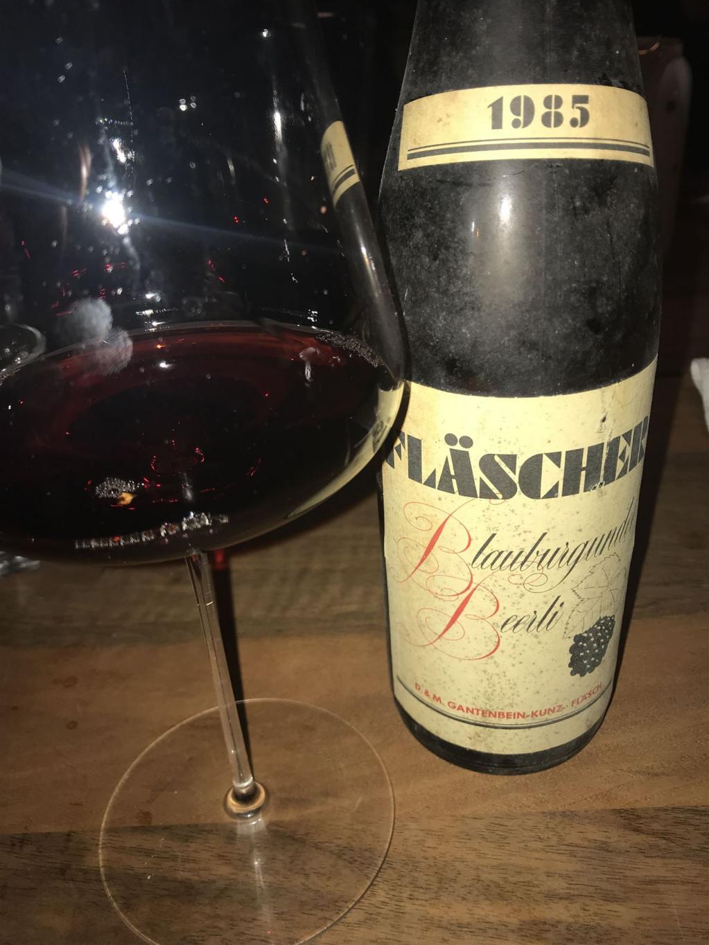 Da kam dann irgendwie die Frage auf, ob es 1985 schon Gantenbein Weine gegeben hat. Das wurde klar bejaht. 1982 gab es den ersten Wein. Der vierte Jahrgang 1985 soll damals sehr gut gewesen sein und auch ein paar Goldmedaillen eingeheimst haben. Aber schmeckt so etwas heute? Darauf konnte es nur eine Antwort geben, natürlich in flüssiger Form. Martha Gantenbein holte für uns Glückliche eine der ganz wenigen, noch vorhandenen Flaschen aus dem Keller. Richtiggehend putzig Aussehen und Name dieses 1985 Fläscher Blauburgunder Beerli von D. & M. Gantenbein-Kunz. Aber was dann ins Glas kam, das war eine große Überraschung. Im Stahltank ohne Holz war der Wein damals ausgebaut worden. Brilliant ohne jedes Alter die klare, rote Farbe, so frisch und so delikat mit betörender Frucht, reife Himbeere, immer noch gute Säure, stand wie eine Eins im Glas und baute nicht ab. Ein absoluter Genuss dieser perfekt balancierte, stimmige Wein und ein echtes Erlebnis. Das war schon einmalig, wie sich dieser immerhin jetzt 33jährige Wein hier präsentierte. Auch ohne Hochachtung für diese großartige Leistung waren das glockenklare WT94. Womit sich Fragen nach der Alterungsfähigkeit von Gantenbein-Weinen erübrigt haben dürften. Wenn so ein Wein von jungen Reben aus der Anfangszeit und aus dem Stahltank immer noch solch eine Frische zeigt, sollte man sich bei den heutigen Gantenbeins eher Sorgen um die eigene Gesundheit machen, als um die Alterungsfähigkeit dieser Weine.