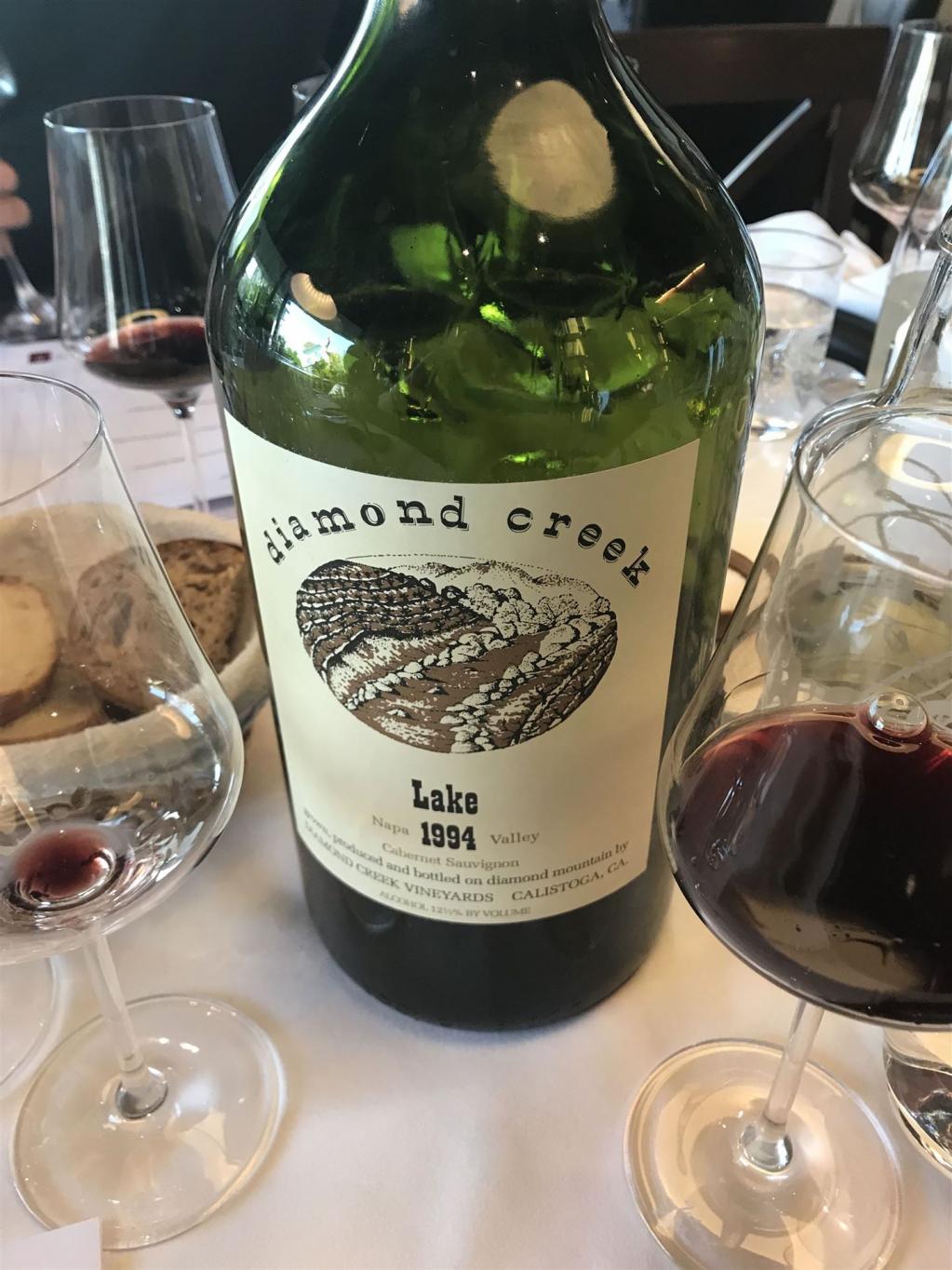 Fast hätten wir den einmaligen Tischwein vergessen, der Maßstäbe setzte und es allen nachfolgenden Weinen verdammt schwer machte. Einer der rarsten, kalifornischen weine überhaupt ist der Lake von Diamond Creek. In einer sehr kühlen Berglage entsteht dieser Wein aus Reben einer Miniparzelle von mal gerade ¾ Acre, auf der die Trauben nur in sehr guten Jahren reif werden. Und dieses so seltene Teil, das selbst die meisten meiner amerikanischen Weinfreunde noch nie gesehen haben, spendierte uns der liebe Eugen hier in einer sensationellen, einmaligen Doppelmagnum! Der Inbegriff von Eleganz war dieser perfekt balancierte, so unglaublich stimmige 1994 Diamond Creek Lake, so präzise und mineralisch mit betörender, minziger Frucht und einfach traumhaftem Trinkfluss. Das war schlicht und einfach Perfektion – WT100. Nein, ich erwähne jetzt nicht, wie viele Gläser ich von dieser Wahnsinns-DM genehmigt habe.
