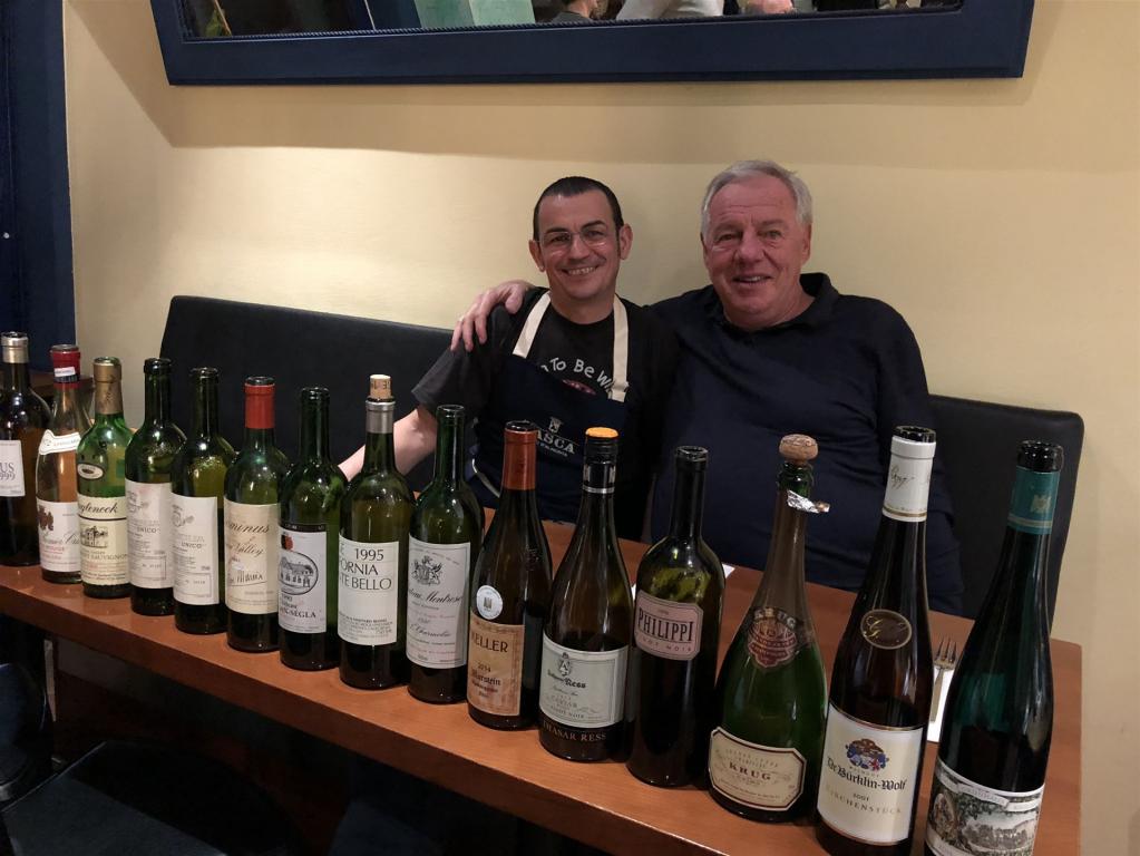 Im Antici Sapori bei Franco Frau haben wir ein einmaliges Feuerwerk abgebrannt. Kann man besser auf so eine Prowein anstoßen als mit einer goldgelben, perfekt gereiften und 1992 degorgierten Krug Grand Cuvée, in der die besten Jahrgänge aus 1978-1985 sind? Der perfekte Champagner für Rotweintrinker mit enormer Kraft und Fülle, tiefes Goldgelb, immer noch feines Mousseux, reife Trockenfrüchte, enormer Tiefgang und Länge, und trotz scheinbarer Reife noch so frisch – WT96. Blutjung mit viel Babyspeck, hoher Extraktsüße aber auch toller Struktur und Mineralität und damit grandioser Zukunft das 2016 Abtsberg GG von Grünhaus, das mit ein paar Jahren Geduld viel mehr als WT93+ zeigen dürfte. sehr viel gereifter mit deutlichem Petrolton das komplexe 2001 Kirchenstück GC von Bürklin-Wolf, das ich deutlich besser und frischer kenne – WT93.