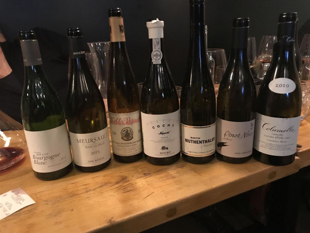 Mit einem gut gemachten, blitzsauberen 2014 Bourgogne Blanc von Roulot starteten wir in den Abend. Der überraschte mit guter, präziser Struktur und zeigte deutlich, dass man die großen Winzer gerade auch an ihren kleineren Weinen erkennt – WT90. Sehr elegant, finessig, frisch und würzig der schlanke 2015 Meursault Sous La Velle von Anne Boisson, der in seiner feinen Art schon etwas rieslinghaftes hat und sicher noch zulegt – WT91+. Überragend wieder die 2007 Kallstadter Saumagen Auslese trocken RR von Koehler-Ruprecht, der wir hier leider nicht die Zeit gegeben haben, um alles zu zeigen – WT97+. Kräftig und mineralisch der 2012 Coche Branco von Niepoort, bei dem man immer noch deutliches Holz zu spüren meint – WT93. Druckvoll, komplex, aber auch sehr balanciert der 2014 Grüne Veltliner Ried Schön von Muthenthaler, für nur 12% Alkohol erstaunlich extraktstark – WT93. Schwierig wurde es dann mit dem hoch gelobten 2015 Pinot Noix von Daniel Twardowski. Da war das erste Glas bzw. der erste Schluck schon beeindruckend, doch wurde dieser Wein schnell sättigend und fand keine Freunde am Tisch – WT90?. Gelungener Abschluss der 2010 Columella von Sadie Family, der sich wieder als großer Wein von der nördlichen Rhone präsentierte – WT96.