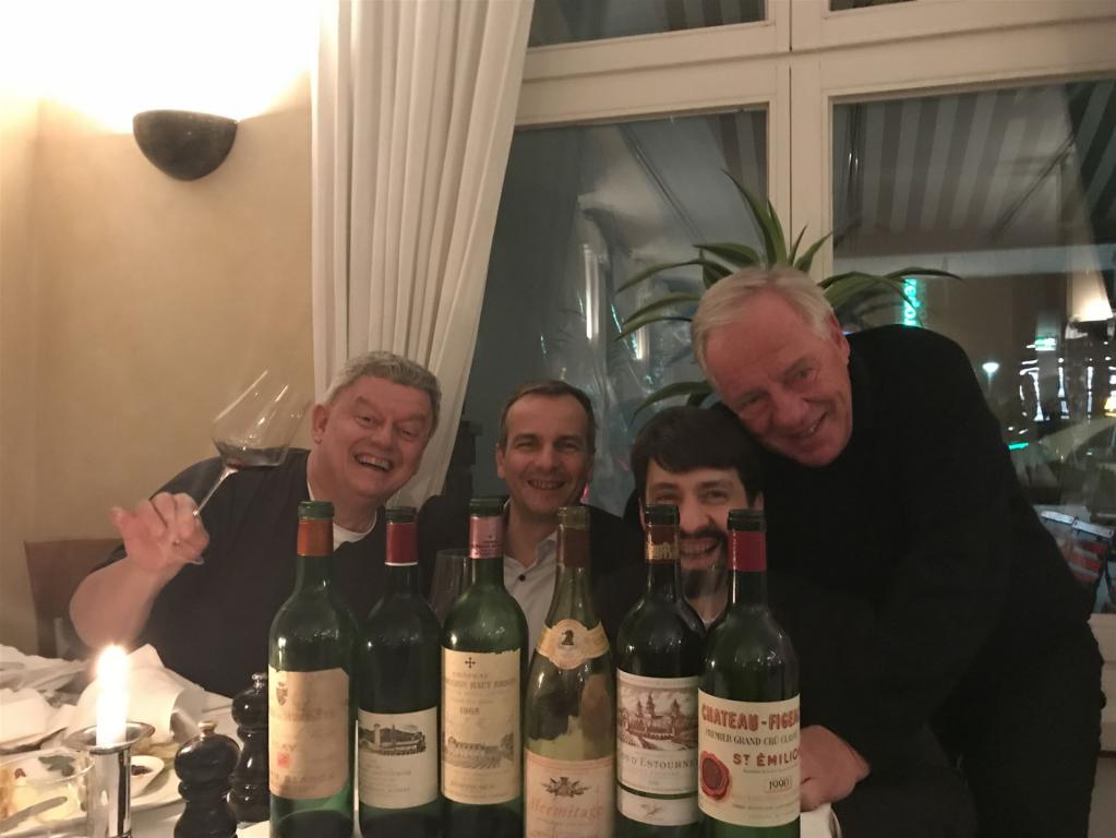 So frisch noch dieser 1962 Marques de Murrieta Etiqueta Blanca, der exemplarisch zeigte, wie gut Riojas auch jenseits hoch gelobter reservas altern können, dicht, kräftig, ledrig und schön zu trinken – WT93. Atemberaubend danach der 1968 Mondavi Cabernet Sauvignon Unfiltered, Robert Mondavis dritter Jahrgang des eigenen Weingutes. Der wirkte noch so jung mit unglaublicher Leichtigkeit und gleichzeitig mit sehr druckvoller Aromatik. Feine, rotbeerige Frucht, herrliche Minzfrische und ein Schuß Eukalyptus, so stimmig und kräftig mit voll intakter Tannin- und Säurestruktur. Ein grandioser Old School Kalifornier, mit dem in 68 Geborene in diesem Jahr locker ihren 50er und in 10 Jahren ihren 60er feiern können – WT96. 1968 war ein sehr gutes Kalifornienjahr, in dem weitere Ausgrabungen sehr lohnen. In Bordeaux sah es weniger gut aus, aber da gibt es nun mal ein Chateau, das damals in Riesenjahren Riesenweine produziert hat, und in kleinen Jahren immer noch sehr gute. Da war es kein Wunder, das auch dieser 1968 La Mission Haut Brion alles andere als ein Greis war, sondern ein sehr vitaler, klassischer Pessac, der sich aus dieser bestens gelagerten Flasche mit der typischen Cigarbox-Aromatik, mit teeriger Mineralität und altem Sattelleder, dazu mit Minze und auch etwas Eukalyptus von seiner allerbesten Seite zeigte – WT94. Auch hier bei derartigen Flaschen keine Eile. Wie man solche Ausnahmeflaschen findet? Am einfachsten natürlich aus perfekter Lagerung im eigenen, kalten, feuchten Keller. Und sonst versuchen, aus solcher Lagerung möglichst als zweiter Besitze zu kaufen. Es lohnt. Dazu gehört dann natürlich auch Flaschenglück, wie wir es in geradezu unverschämter Form beim nächsten Wein hatten. Ein würzig-pfeffriger Rhone Gigant war dieser 1981 Hermitage von Jaboulet-Vercherre mit frischer, animierender, dunkler Frucht und irrer Länge, explodierte förmlich im Glas und baute enorm aus. Lag gefühlt sehr deutlich über dem hier an gleicher Stelle getrunkenen 1981 Hermitage von Chave – WT97. Und unsere Glücksstähne ging weiter mit zwei fantastischen Bordeaux aus dem großen Jahrgang 1990. Sehr neugierig war ich auf den 1990 Cos d´Estournel gewesen. In den 90ern war das mit jugendlicher Röstaromatik ein oft getrunkener, jugendlicher Held und Superstar. Danach machte er es wie vorher der 1982er. Er verschloss sich etliche Jahre, um sich dann nur zögerlich zu öffnen. Doch jetzt hier aus einer seit der Subskription unberührt liegenden Kiste war er in Traumform, Cos at it´s very best – WT97. Und der 1990 Figeac im anderen Glas? Von dem könnte ich die gleiche Geschichte erzählen. Auch der zeigte sich in bestechender, einmaliger Form mit glockenklarer, betörender Frucht und feiner Kräuternote, dazu gewaltigem, aromatischem Druck am Gaumen – WT97.